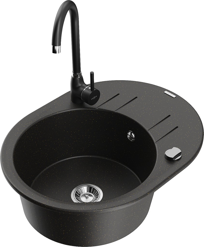 Technické dáta: drez: Rozmer: 586 x 458 x 190 mm Hĺbka komory: 180 mm Šírka komory: 378x374 mm Priemer odtoku: ø90 mm Typ: 1-miska s krátkym odkvapkávačom Typ: Zapustené do pracovnej dosky Farba: čierna / zlatá metalíza Povrchová úprava sifónu: Chrome Materiál: žula (80% žulové kamenivo, 20% živice) Prepadový otvor: Áno Otvory: (batérie, automatické) 2 Inštalácia: Univerzálna, je možné inštalovať s odkvapkávačom na ľavú alebo pravú stranu Vysoká odolnosť proti poškriabaniu a zmene farby Odolnosť proti tepelným šokom Ľahko čistiteľný povrch Jeden dodatočný vyfrézovaný otvor na samodierovanie ø35 kuchynská batéria: Materiál: mosadz Čierna farba Hlava: Keramická Prevzdušňovač: Áno Typ: Jedna páka Výška batérie: 335 mm Rozsah výtoku: 180 mm(GT) Ean: 5905315016454