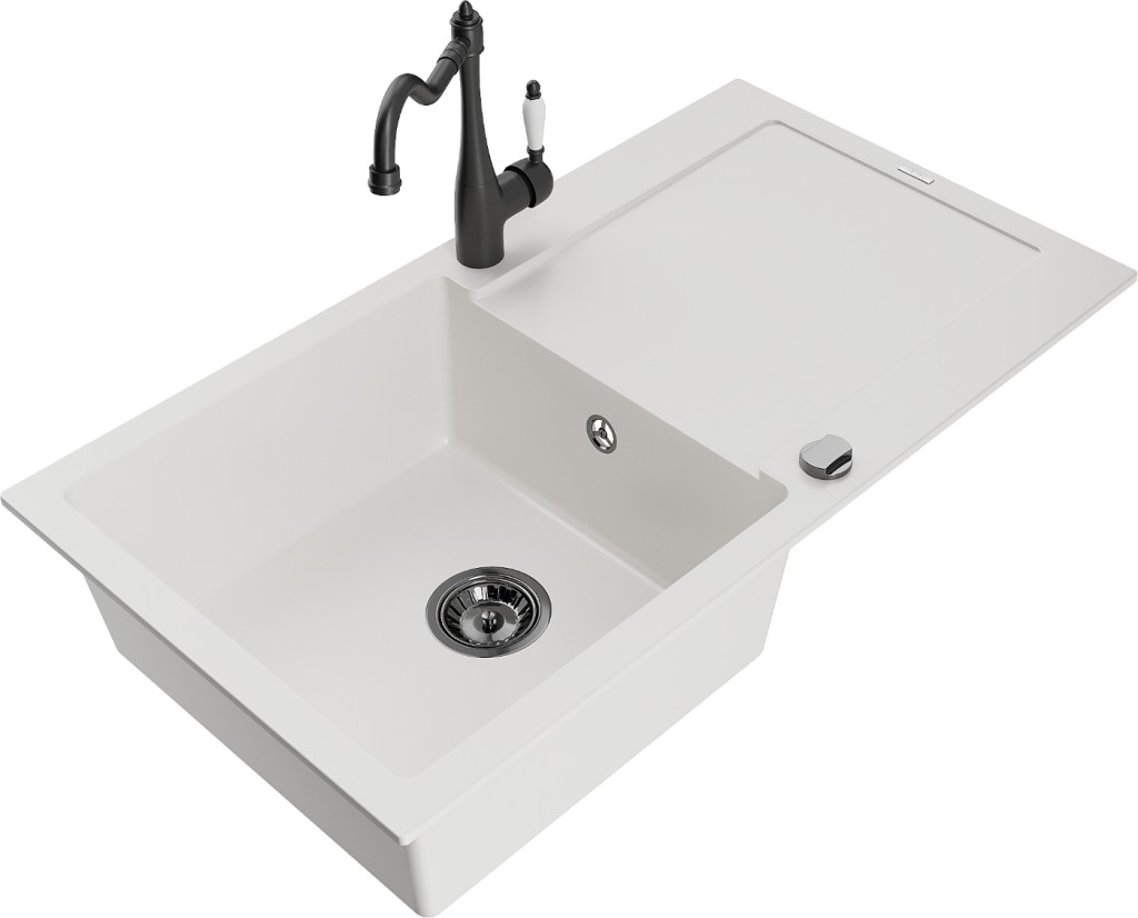 Technické dáta: drez: Rozmer: 900x500x190mm Hĺbka komory: 180 mm Rozmery komory: 430x415 mm Priemer odtoku: ø90 mm Typ: 1-miska s odkvapkávačom Typ: Zapustené do pracovnej dosky biela farba Povrchová úprava sifónu: čierna Materiál: žula (80% žulové kamenivo, 20% živice) Prepadový otvor: Áno Otvory: (batérie, automatické) 2 Inštalácia: Univerzálna, je možné inštalovať s odkvapkávačom na ľavú alebo pravú stranu Vysoká odolnosť proti poškriabaniu a zmene farby Odolnosť proti tepelným šokom Ľahko čistiteľný povrch Dva dodatočné vyfrézované otvory na samodierovanie ø35 kuchynská batéria: Materiál: mosadz Čierna farba Hlava: Keramická Prevzdušňovač: Áno Typ: Jedna páka Výška batérie: 290 mm Rozsah výtoku: 260 mm(GT) Ean: 5905315037411