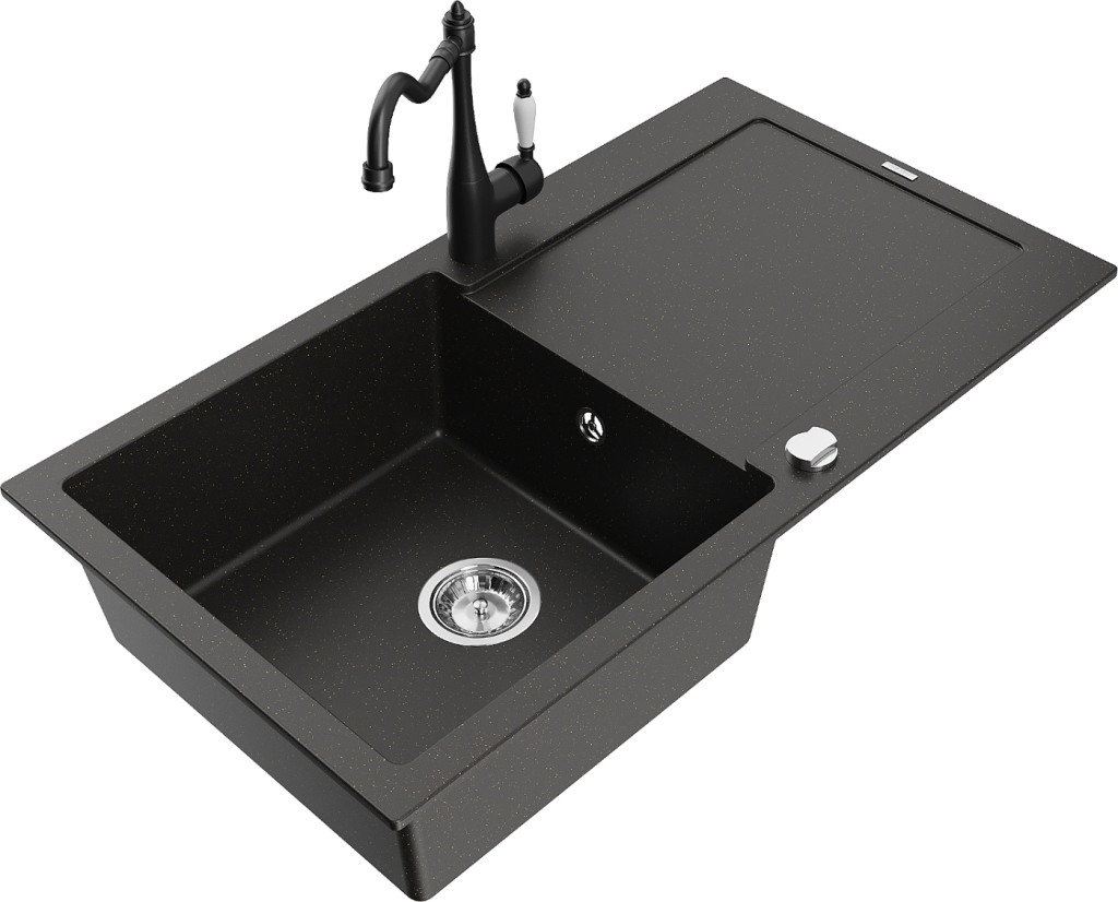 Technické dáta: drez: Rozmer: 900x500x190mm Hĺbka komory: 180 mm Rozmery komory: 430x415 mm Priemer odtoku: ø90 mm Typ: 1-miska s odkvapkávačom Typ: Zapustené do pracovnej dosky Farba: čierna / zlatá metalíza Povrchová úprava sifónu: Chrome Materiál: žula (80% žulové kamenivo, 20% živice) Prepadový otvor: Áno Otvory: (batérie, automatické) 2 Inštalácia: Univerzálna, je možné inštalovať s odkvapkávačom na ľavú alebo pravú stranu Vysoká odolnosť proti poškriabaniu a zmene farby Odolnosť proti tepelným šokom Ľahko čistiteľný povrch Dva dodatočné vyfrézované otvory na samodierovanie ø35 kuchynská batéria: Materiál: mosadz Čierna farba Hlava: Keramická Prevzdušňovač: Áno Typ: Jedna páka Výška batérie: 290 mm Rozsah výtoku: 260 mm(GT) Ean: 5905315037589