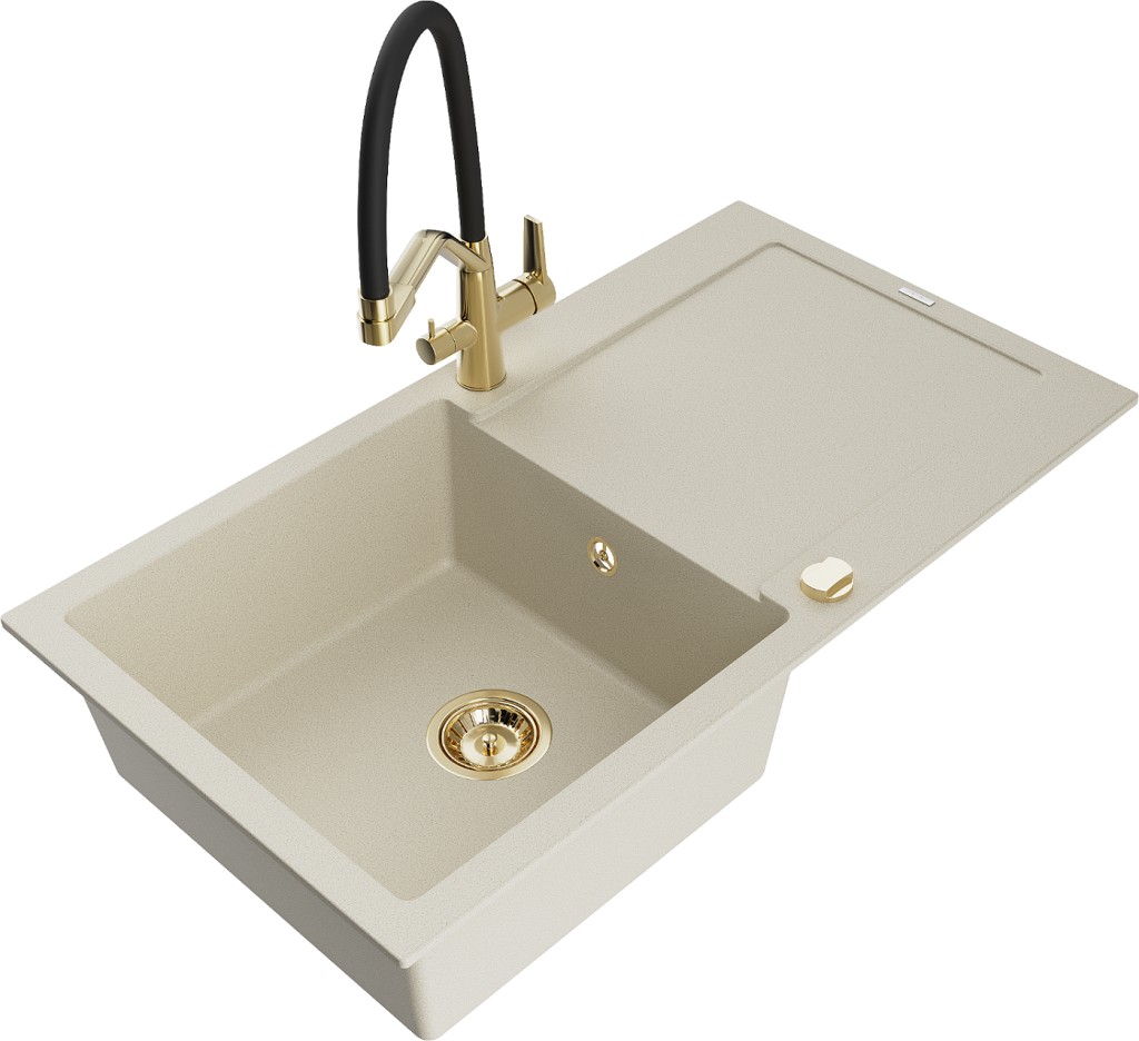 Technické dáta: drez: Rozmer: 900x500x190mm Hĺbka komory: 180 mm Rozmery komory: 430x415 mm Priemer odtoku: ø90 mm Typ: 1-miska s odkvapkávačom Typ: Zapustené do pracovnej dosky Farba béžová Povrchová úprava sifónu: zlatá Materiál: žula (80% žulové kamenivo, 20% živice) Prepadový otvor: Áno Otvory: (batérie, automatické) 2 Inštalácia: Univerzálna, je možné inštalovať s odkvapkávačom na ľavú alebo pravú stranu Vysoká odolnosť proti poškriabaniu a zmene farby Odolnosť proti tepelným šokom Ľahko čistiteľný povrch Dva dodatočné vyfrézované otvory na samodierovanie ø35 kuchynská batéria: Materiál: mosadz Povrchová úprava: zlatá/čierna Hlavy: Keramické Prevzdušňovač: Áno Typ hubica: Flexibilný s mosadzným držiakom Rozsah výtoku: 260 mm Výška: 405 mm Typ: Dve rukoväte Dvojhlavá batéria s prídavným kanálom pre filtrovanú pitnú vodu(GT) Ean: 5905315049322