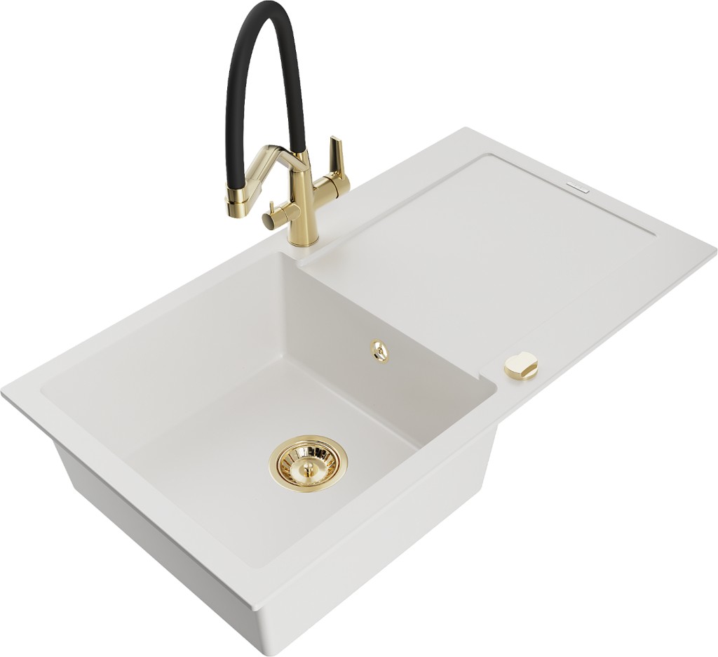 Technické dáta: drez: Rozmer: 900x500x190mm Hĺbka komory: 180 mm Rozmery komory: 430x415 mm Priemer odtoku: ø90 mm Typ: 1-miska s odkvapkávačom Typ: Zapustené do pracovnej dosky biela farba Povrchová úprava sifónu: zlatá Materiál: žula (80% žulové kamenivo, 20% živice) Prepadový otvor: Áno Otvory: (batérie, automatické) 2 Inštalácia: Univerzálna, je možné inštalovať s odkvapkávačom na ľavú alebo pravú stranu Vysoká odolnosť proti poškriabaniu a zmene farby Odolnosť proti tepelným šokom Ľahko čistiteľný povrch Dva dodatočné vyfrézované otvory na samodierovanie ø35 kuchynská batéria: Materiál: mosadz Povrchová úprava: zlatá/čierna Hlavy: Keramické Prevzdušňovač: Áno Typ hubica: Flexibilný s mosadzným držiakom Rozsah výtoku: 260 mm Výška: 405 mm Typ: Dve rukoväte Dvojhlavá batéria s prídavným filtrom na pitnú vodu(GT) Ean: 5905315049261