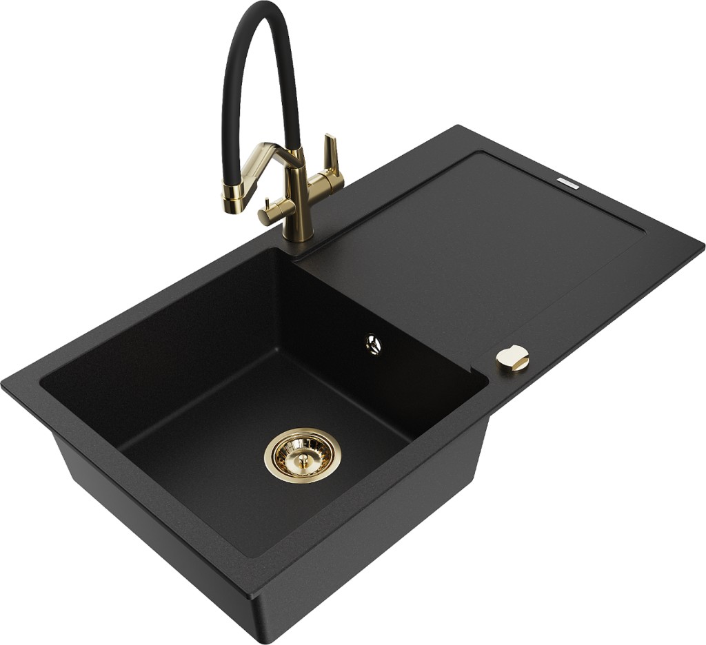 Technické dáta: drez: Rozmer: 900x500x190mm Hĺbka komory: 180 mm Rozmery komory: 430x415 mm Priemer odtoku: ø90 mm Typ: 1-miska s odkvapkávačom Typ: Zapustené do pracovnej dosky Čierna farba Povrchová úprava sifónu: zlatá Materiál: žula (80% žulové kamenivo, 20% živice) Prepadový otvor: Áno Otvory: (batérie, automatické) 2 Inštalácia: Univerzálna, je možné inštalovať s odkvapkávačom na ľavú alebo pravú stranu Vysoká odolnosť proti poškriabaniu a zmene farby Odolnosť proti tepelným šokom Ľahko čistiteľný povrch Dva dodatočné vyfrézované otvory na samodierovanie ø35 kuchynská batéria: Materiál: mosadz Povrchová úprava: zlatá/čierna Hlavy: Keramické Prevzdušňovač: Áno Typ hubica: Flexibilný s mosadzným držiakom Rozsah výtoku: 260 mm Výška: 405 mm Typ: Dve rukoväte Dvojhlavá batéria s prídavným kanálom pre filtrovanú pitnú vodu(GT) Ean: 5905315049629