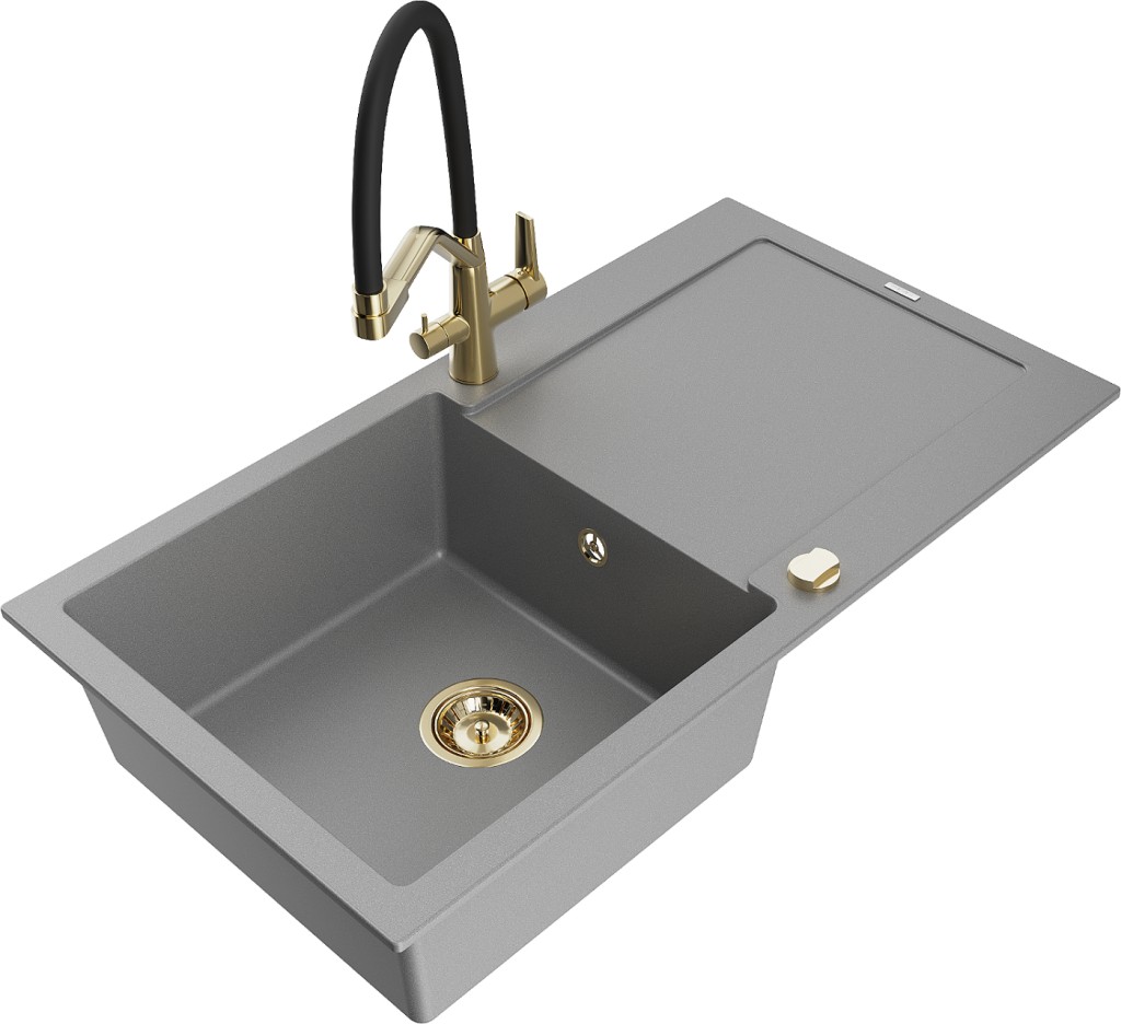 Technické dáta: drez: Rozmer: 900x500x190mm Hĺbka komory: 180 mm Rozmery komory: 430x415 mm Priemer odtoku: ø90 mm Typ: 1-miska s odkvapkávačom Typ: Zapustené do pracovnej dosky Šedá farba Povrchová úprava sifónu: zlatá Materiál: žula (80% žulové kamenivo, 20% živice) Prepadový otvor: Áno Otvory: (batérie, automatické) 2 Inštalácia: Univerzálna, je možné inštalovať s odkvapkávačom na ľavú alebo pravú stranu Vysoká odolnosť proti poškriabaniu a zmene farby Odolnosť proti tepelným šokom Ľahko čistiteľný povrch Dva dodatočné vyfrézované otvory na samodierovanie ø35 kuchynská batéria: Materiál: mosadz Povrchová úprava: zlatá/čierna Hlavy: Keramické Prevzdušňovač: Áno Typ hubica: Flexibilný s mosadzným držiakom Rozsah výtoku: 260 mm Výška: 405 mm Typ: Dve rukoväte Dvojhlavá batéria s prídavným kanálom pre filtrovanú pitnú vodu(GT) Ean: 5905315049384