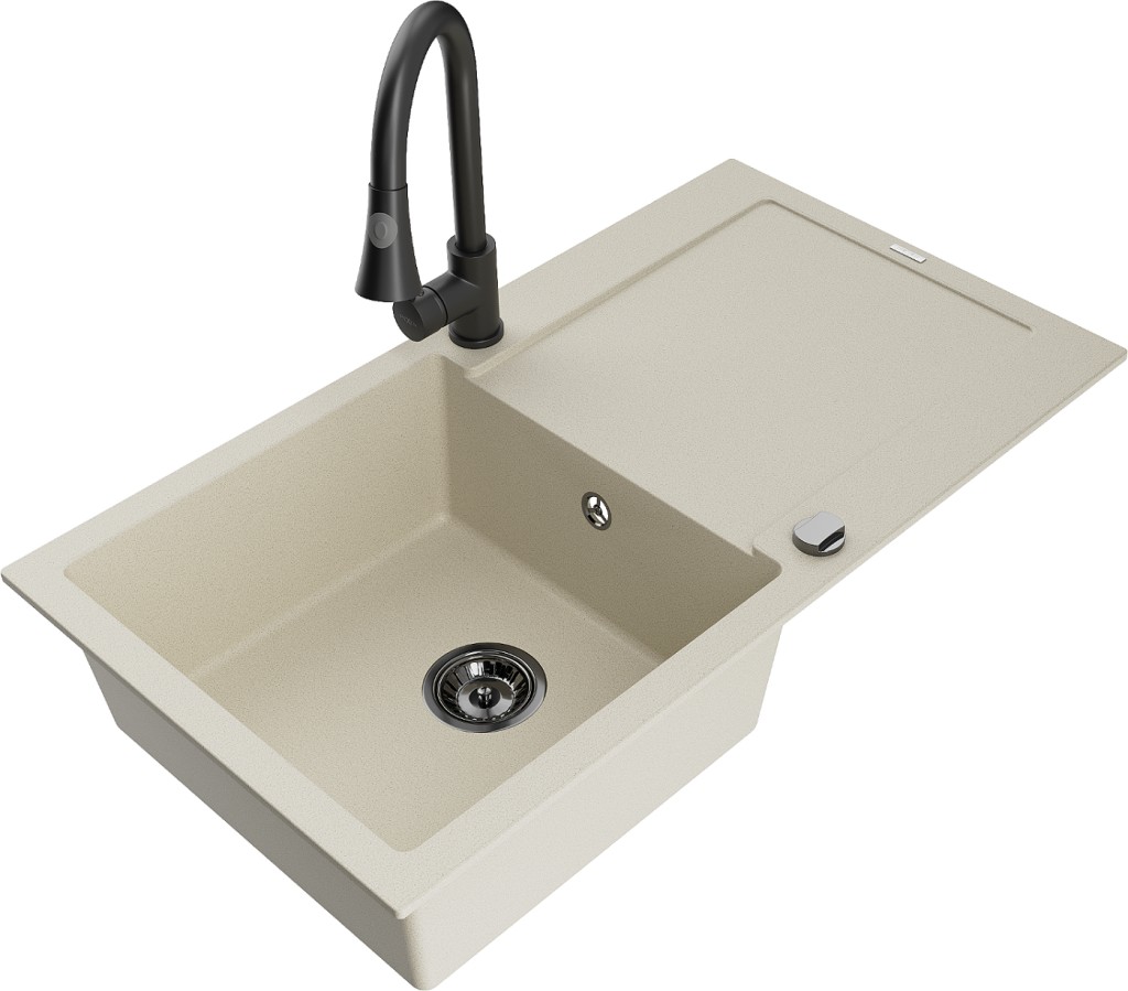 Technické dáta: drez: Rozmer: 900x500x190mm Hĺbka komory: 180 mm Rozmery komory: 430x415 mm Priemer odtoku: ø90 mm Typ: 1-miska s odkvapkávačom Typ: Zapustené do pracovnej dosky Farba béžová Povrchová úprava sifónu: čierna Materiál: žula (80% žulové kamenivo, 20% živice) Prepadový otvor: Áno Otvory: (batérie, automatické) 2 Inštalácia: Univerzálna, je možné inštalovať s odkvapkávačom na ľavú alebo pravú stranu Vysoká odolnosť proti poškriabaniu a zmene farby Odolnosť proti tepelným šokom Ľahko čistiteľný povrch Dva dodatočné vyfrézované otvory na samodierovanie ø35 kuchynská batéria: Materiál: mosadz Čierna farba Hlava: Keramická Prevzdušňovač: Áno Typ: Jedna páka Výška batérie: 380 mm Rozsah výtoku: 252 mm Typ výtoku: Výsuvný(GT) Ean: 5905315027207