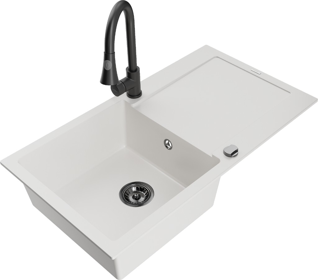 Technické dáta: drez: Rozmer: 900x500x190mm Hĺbka komory: 180 mm Rozmery komory: 430x415 mm Priemer odtoku: ø90 mm Typ: 1-miska s odkvapkávačom Typ: Zapustené do pracovnej dosky biela farba Povrchová úprava sifónu: čierna Materiál: žula (80% žulové kamenivo, 20% živice) Prepadový otvor: Áno Otvory: (batérie, automatické) 2 Inštalácia: Univerzálna, je možné inštalovať s odkvapkávačom na ľavú alebo pravú stranu Vysoká odolnosť proti poškriabaniu a zmene farby Odolnosť proti tepelným šokom Ľahko čistiteľný povrch Dva dodatočné vyfrézované otvory na samodierovanie ø35 kuchynská batéria: Materiál: mosadz Čierna farba Hlava: Keramická Prevzdušňovač: Áno Typ: Jedna páka Výška batérie: 380 mm Rozsah výtoku: 252 mm Typ výtoku: Výsuvný(GT) Ean: 5905315027160
