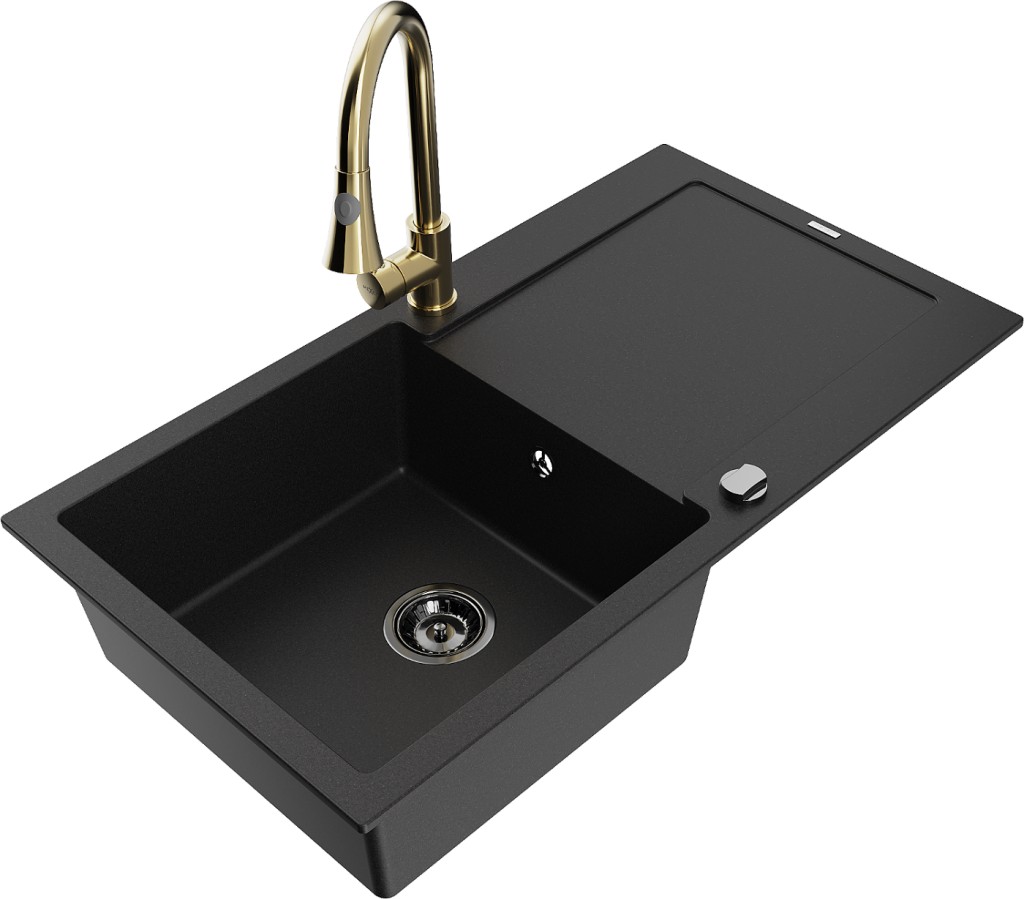 Technické dáta: drez: Rozmer: 900x500x190mm Hĺbka komory: 180 mm Rozmery komory: 430x415 mm Priemer odtoku: ø90 mm Typ: 1-miska s odkvapkávačom Typ: Zapustené do pracovnej dosky Čierna farba Povrchová úprava sifónu: čierna Materiál: žula (80% žulové kamenivo, 20% živice) Prepadový otvor: Áno Otvory: (batérie, automatické) 2 Inštalácia: Univerzálna, je možné inštalovať s odkvapkávačom na ľavú alebo pravú stranu Vysoká odolnosť proti poškriabaniu a zmene farby Odolnosť proti tepelným šokom Ľahko čistiteľný povrch Dva dodatočné vyfrézované otvory na samodierovanie ø35 kuchynská batéria: Materiál: mosadz Farba: Zlatá Hlava: Keramická Prevzdušňovač: Áno Typ: Jedna páka Výška batérie: 380 mm Rozsah výtoku: 252 mm Typ výtoku: Výsuvný(GT) Ean: 5905315027412