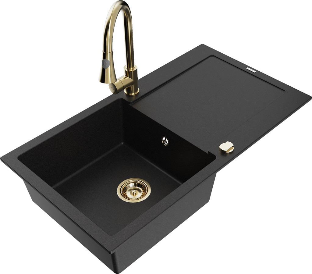 Technické dáta: drez: Rozmer: 900x500x190mm Hĺbka komory: 180 mm Rozmery komory: 430x415 mm Priemer odtoku: ø90 mm Typ: 1-miska s odkvapkávačom Typ: Zapustené do pracovnej dosky Čierna farba Povrchová úprava sifónu: zlatá Materiál: žula (80% žulové kamenivo, 20% živice) Prepadový otvor: Áno Otvory: (batérie, automatické) 2 Inštalácia: Univerzálna, je možné inštalovať s odkvapkávačom na ľavú alebo pravú stranu Vysoká odolnosť proti poškriabaniu a zmene farby Odolnosť proti tepelným šokom Ľahko čistiteľný povrch Dva dodatočné vyfrézované otvory na samodierovanie ø35 kuchynská batéria: Materiál: mosadz Farba: Zlatá Hlava: Keramická Prevzdušňovač: Áno Typ: Jedna páka Výška batérie: 380 mm Rozsah výtoku: 252 mm Typ výtoku: Výsuvný(GT) Ean: 5905315027405