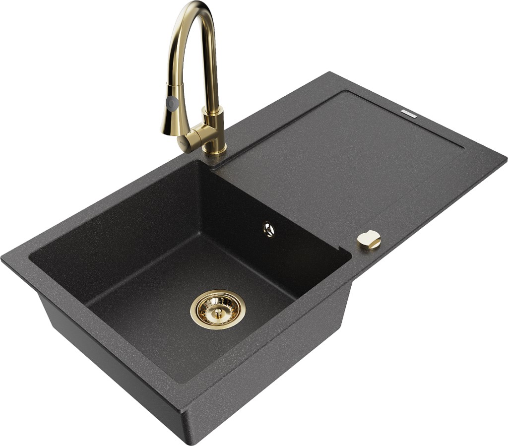 Technické dáta: drez: Rozmer: 900x500x190mm Hĺbka komory: 180 mm Rozmery komory: 430x415 mm Priemer odtoku: ø90 mm Typ: 1-miska s odkvapkávačom Typ: Zapustené do pracovnej dosky Farba: Škvrnitá čierna Povrchová úprava sifónu: zlatá Materiál: žula (80% žulové kamenivo, 20% živice) Prepadový otvor: Áno Otvory: (batérie, automatické) 2 Inštalácia: Univerzálna, je možné inštalovať s odkvapkávačom na ľavú alebo pravú stranu Vysoká odolnosť proti poškriabaniu a zmene farby Odolnosť proti tepelným šokom Ľahko čistiteľný povrch Dva dodatočné vyfrézované otvory na samodierovanie ø35 kuchynská batéria: Materiál: mosadz Farba: Zlatá Hlava: Keramická Prevzdušňovač: Áno Typ: Jedna páka Výška batérie: 380 mm Rozsah výtoku: 252 mm Typ výtoku: Výsuvný(GT) Ean: 5905315027368