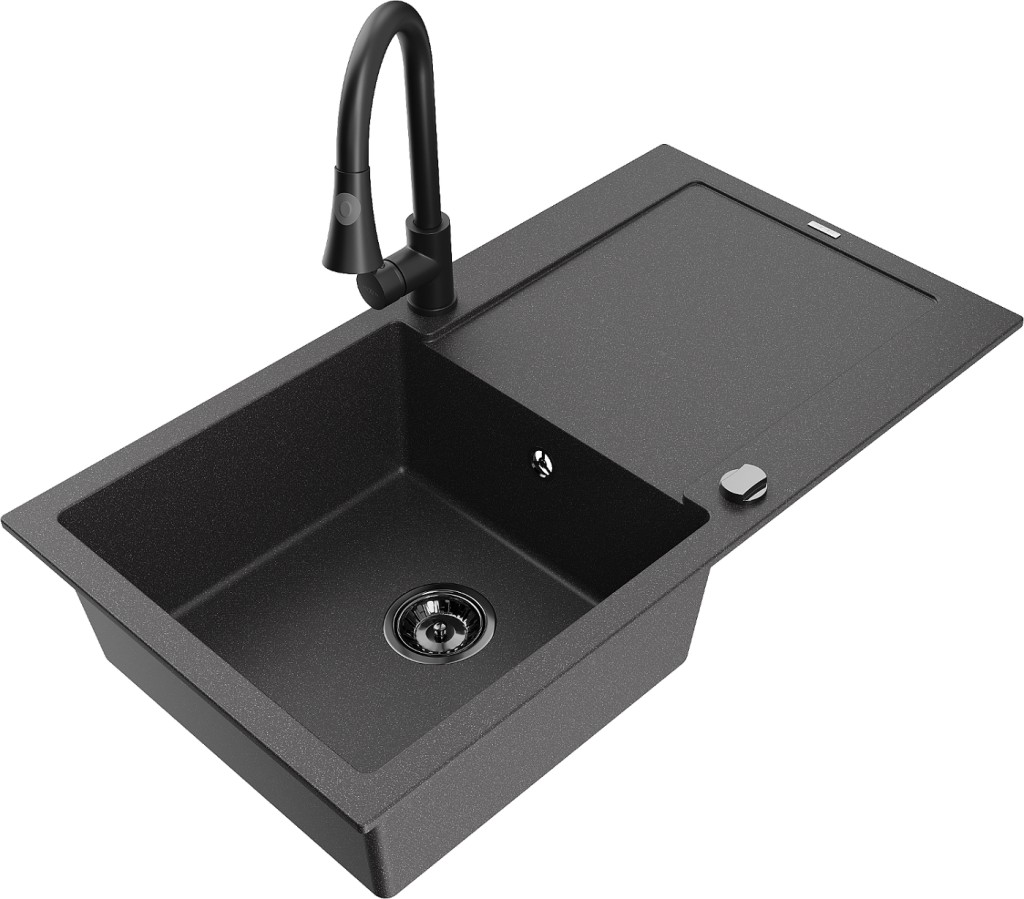 Technické dáta: drez: Rozmer: 900x500x190mm Hĺbka komory: 180 mm Rozmery komory: 430x415 mm Priemer odtoku: ø90 mm Typ: 1-miska s odkvapkávačom Typ: Zapustené do pracovnej dosky Farba: Škvrnitá čierna Povrchová úprava sifónu: čierna Materiál: žula (80% žulové kamenivo, 20% živice) Prepadový otvor: Áno Otvory: (batérie, automatické) 2 Inštalácia: Univerzálna, je možné inštalovať s odkvapkávačom na ľavú alebo pravú stranu Vysoká odolnosť proti poškriabaniu a zmene farby Odolnosť proti tepelným šokom Ľahko čistiteľný povrch Dva dodatočné vyfrézované otvory na samodierovanie ø35 kuchynská batéria: Materiál: mosadz Čierna farba Hlava: Keramická Prevzdušňovač: Áno Typ: Jedna páka Výška batérie: 380 mm Rozsah výtoku: 252 mm Typ výtoku: Výsuvný(GT) Ean: 5905315027382