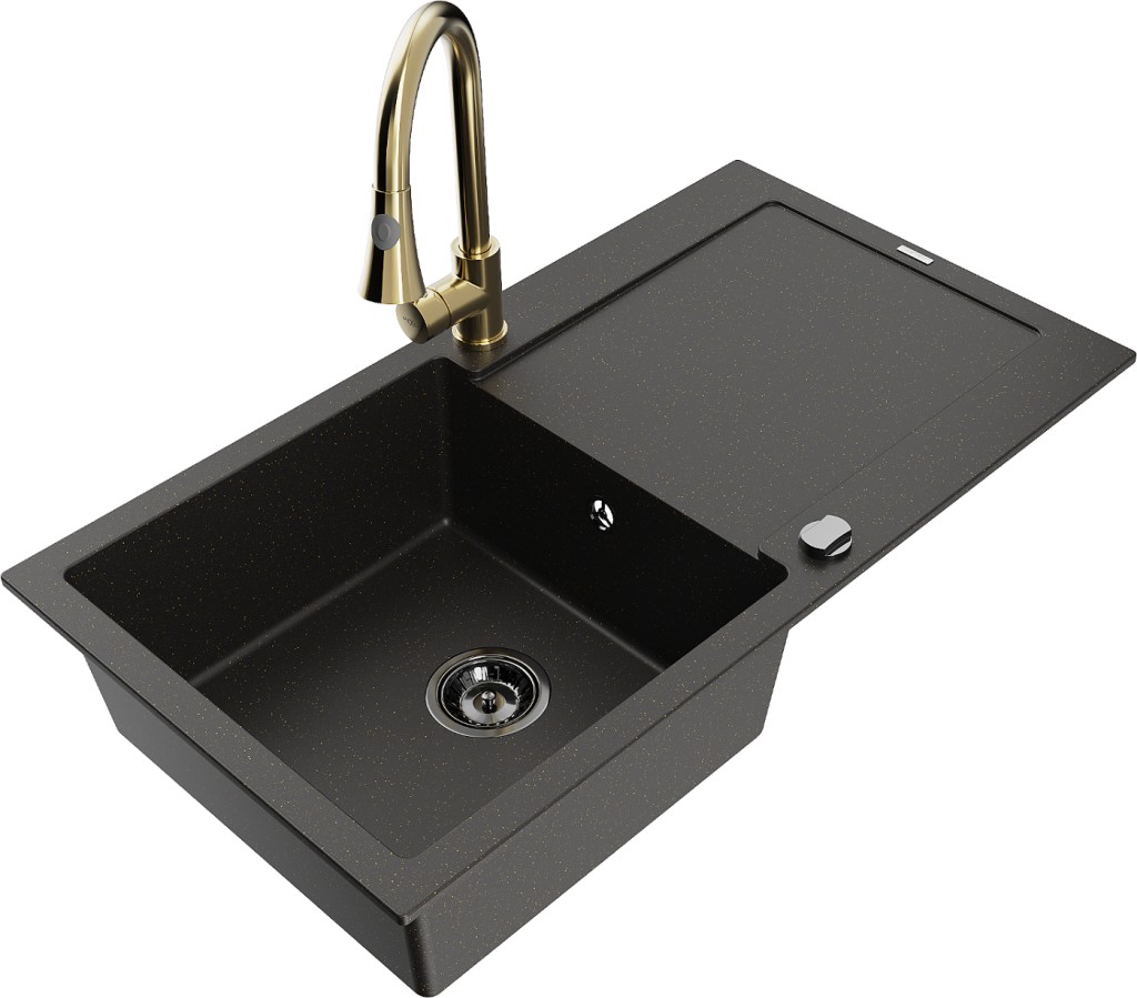 Technické dáta: drez: Rozmer: 900x500x190mm Hĺbka komory: 180 mm Rozmery komory: 430x415 mm Priemer odtoku: ø90 mm Typ: 1-miska s odkvapkávačom Typ: Zapustené do pracovnej dosky Farba: čierna / zlatá metalíza Povrchová úprava sifónu: čierna Materiál: žula (80% žulové kamenivo, 20% živice) Prepadový otvor: Áno Otvory: (batérie, automatické) 2 Inštalácia: Univerzálna, je možné inštalovať s odkvapkávačom na ľavú alebo pravú stranu Vysoká odolnosť proti poškriabaniu a zmene farby Odolnosť proti tepelným šokom Ľahko čistiteľný povrch Dva dodatočné vyfrézované otvory na samodierovanie ø35 kuchynská batéria: Materiál: mosadz Farba: Zlatá Hlava: Keramická Prevzdušňovač: Áno Typ: Jedna páka Výška batérie: 380 mm Rozsah výtoku: 252 mm Typ výtoku: Výsuvný(GT) Ean: 5905315027320
