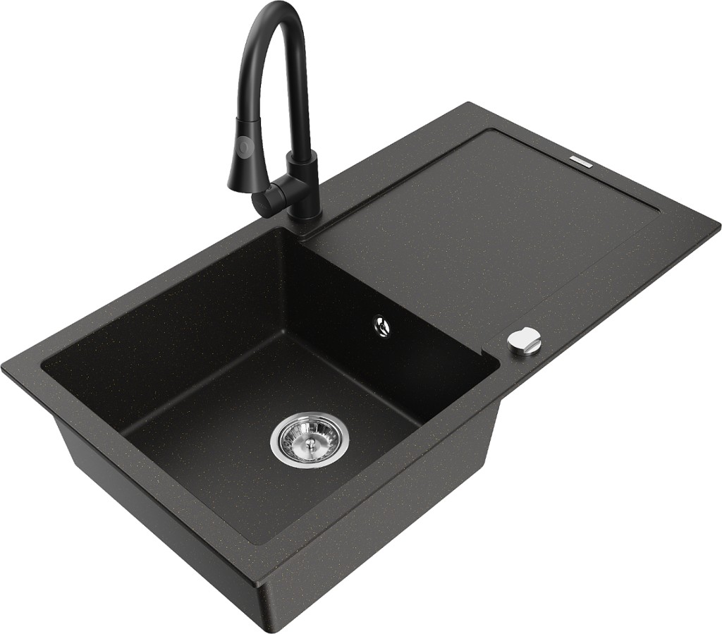 Technické dáta: drez: Rozmer: 900x500x190mm Hĺbka komory: 180 mm Rozmery komory: 430x415 mm Priemer odtoku: ø90 mm Typ: 1-miska s odkvapkávačom Typ: Zapustené do pracovnej dosky Farba: čierna / zlatá metalíza Povrchová úprava sifónu: Chrome Materiál: žula (80% žulové kamenivo, 20% živice) Prepadový otvor: Áno Otvory: (batérie, automatické) 2 Inštalácia: Univerzálna, je možné inštalovať s odkvapkávačom na ľavú alebo pravú stranu Vysoká odolnosť proti poškriabaniu a zmene farby Odolnosť proti tepelným šokom Ľahko čistiteľný povrch Dva dodatočné vyfrézované otvory na samodierovanie ø35 kuchynská batéria: Materiál: mosadz Čierna farba Hlava: Keramická Prevzdušňovač: Áno Typ: Jedna páka Výška batérie: 380 mm Rozsah výtoku: 252 mm Typ výtoku: Výsuvný(GT) Ean: 5905315027337