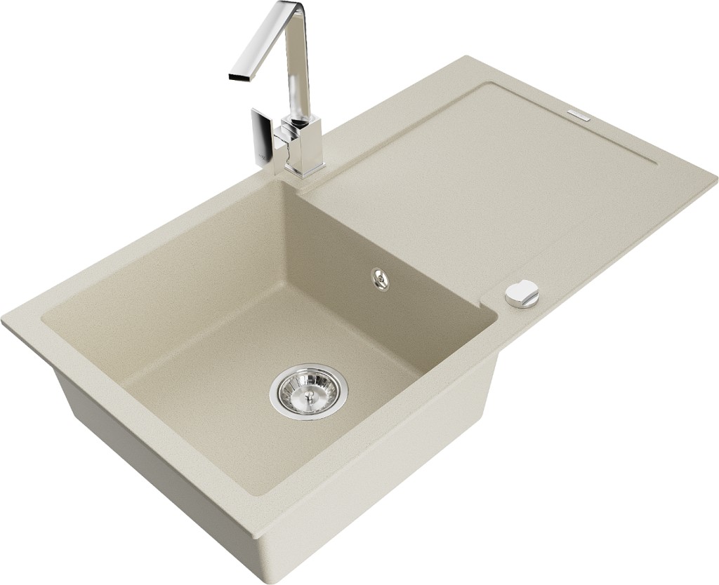 Technické dáta: drez: Rozmer: 900x500x190mm Hĺbka komory: 180 mm Rozmery komory: 430x415 mm Priemer odtoku: ø90 mm Typ: 1-miska s odkvapkávačom Typ: Zapustené do pracovnej dosky Farba béžová Povrchová úprava sifónu: Chrome Materiál: žula (80% žulové kamenivo, 20% živice) Prepadový otvor: Áno Otvory: (batérie, automatické) 2 Inštalácia: Univerzálna, je možné inštalovať s odkvapkávačom na ľavú alebo pravú stranu Vysoká odolnosť proti poškriabaniu a zmene farby Odolnosť proti tepelným šokom Ľahko čistiteľný povrch Dva dodatočné vyfrézované otvory na samodierovanie ø35 kuchynská batéria: Materiál: mosadz Farba: Chrome Hlava: Keramická Prevzdušňovač: Áno Typ: Jedna páka Výška batérie: 290 mm Rozsah výtoku: 220 mm(GT) Ean: 5905315016935