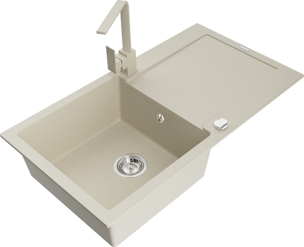 Technické dáta: drez: Rozmer: 900x500x190mm Hĺbka komory: 180 mm Rozmery komory: 430x415 mm Priemer odtoku: ø90 mm Typ: 1-miska s odkvapkávačom Typ: Zapustené do pracovnej dosky Farba béžová Povrchová úprava sifónu: Chrome Materiál: žula (80% žulové kamenivo, 20% živice) Prepadový otvor: Áno Otvory: (batérie, automatické) 2 Inštalácia: Univerzálna, je možné inštalovať s odkvapkávačom na ľavú alebo pravú stranu Vysoká odolnosť proti poškriabaniu a zmene farby Odolnosť proti tepelným šokom Ľahko čistiteľný povrch Dva dodatočné vyfrézované otvory na samodierovanie ø35 kuchynská batéria: Materiál: mosadz Farba béžová Hlava: Keramická Prevzdušňovač: Áno Typ: Jedna páka Výška batérie: 290 mm Rozsah výtoku: 220 mm(GT) Ean: 5905315016942