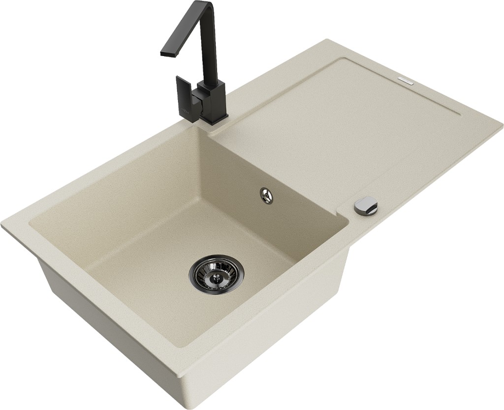 Technické dáta: drez: Rozmer: 900x500x190mm Hĺbka komory: 180 mm Rozmery komory: 430x415 mm Priemer odtoku: ø90 mm Typ: 1-miska s odkvapkávačom Typ: Zapustené do pracovnej dosky Farba béžová Povrchová úprava sifónu: čierna Materiál: žula (80% žulové kamenivo, 20% živice) Prepadový otvor: Áno Otvory: (batérie, automatické) 2 Inštalácia: Univerzálna, je možné inštalovať s odkvapkávačom na ľavú alebo pravú stranu Vysoká odolnosť proti poškriabaniu a zmene farby Odolnosť proti tepelným šokom Ľahko čistiteľný povrch Dva dodatočné vyfrézované otvory na samodierovanie ø35 kuchynská batéria: Materiál: mosadz Čierna farba Hlava: Keramická Prevzdušňovač: Áno Typ: Jedna páka Výška batérie: 290 mm Rozsah výtoku: 220 mm(GT) Ean: 5905315016966