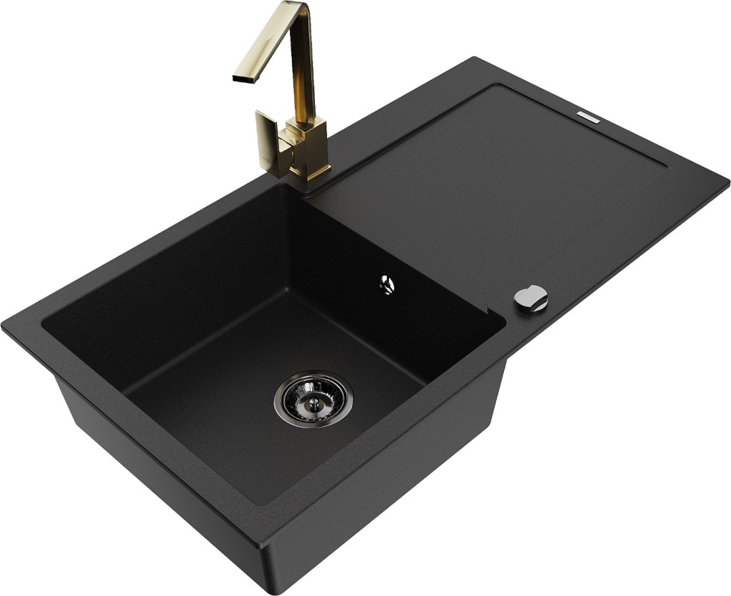 Technické dáta: drez: Rozmer: 900x500x190mm Hĺbka komory: 180 mm Rozmery komory: 430x415 mm Priemer odtoku: ø90 mm Typ: 1-miska s odkvapkávačom Typ: Zapustené do pracovnej dosky Čierna farba Povrchová úprava sifónu: čierna Materiál: žula (80% žulové kamenivo, 20% živice) Prepadový otvor: Áno Otvory: (batérie, automatické) 2 Inštalácia: Univerzálna, je možné inštalovať s odkvapkávačom na ľavú alebo pravú stranu Vysoká odolnosť proti poškriabaniu a zmene farby Odolnosť proti tepelným šokom Ľahko čistiteľný povrch Dva dodatočné vyfrézované otvory na samodierovanie ø35 kuchynská batéria: Materiál: mosadz Farba: Zlatá Hlava: Keramická Prevzdušňovač: Áno Typ: Jedna páka Výška batérie: 290 mm Rozsah výtoku: 220 mm(GT) Ean: 5905315017185