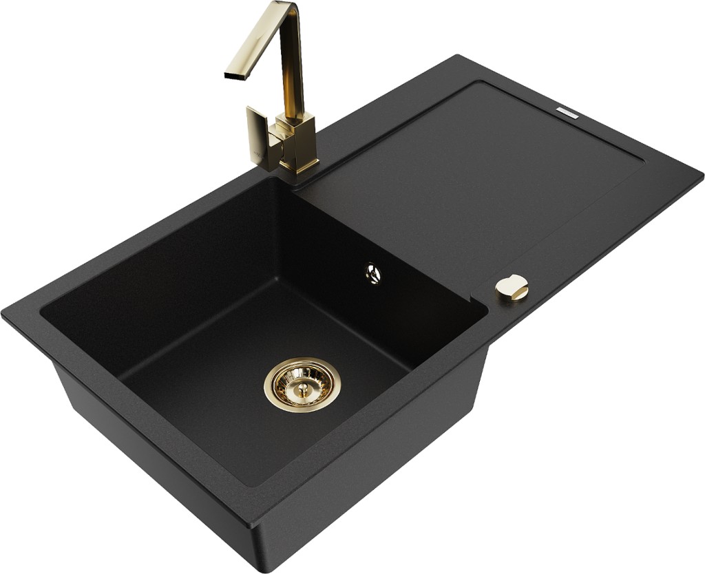 Technické dáta: drez: Rozmer: 900x500x190mm Hĺbka komory: 180 mm Rozmery komory: 430x415 mm Priemer odtoku: ø90 mm Typ: 1-miska s odkvapkávačom Typ: Zapustené do pracovnej dosky Čierna farba Povrchová úprava sifónu: zlatá Materiál: žula (80% žulové kamenivo, 20% živice) Prepadový otvor: Áno Otvory: (batérie, automatické) 2 Inštalácia: Univerzálna, je možné inštalovať s odkvapkávačom na ľavú alebo pravú stranu Vysoká odolnosť proti poškriabaniu a zmene farby Odolnosť proti tepelným šokom Ľahko čistiteľný povrch Dva dodatočné vyfrézované otvory na samodierovanie ø35 kuchynská batéria: Materiál: mosadz Farba: Zlatá Hlava: Keramická Prevzdušňovač: Áno Typ: Jedna páka Výška batérie: 290 mm Rozsah výtoku: 220 mm(GT) Ean: 5905315017178