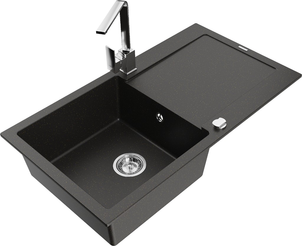 Technické dáta: drez: Rozmer: 900x500x190mm Hĺbka komory: 180 mm Rozmery komory: 430x415 mm Priemer odtoku: ø90 mm Typ: 1-miska s odkvapkávačom Typ: Zapustené do pracovnej dosky Farba: čierna / zlatá metalíza Povrchová úprava sifónu: Chrome Materiál: žula (80% žulové kamenivo, 20% živice) Prepadový otvor: Áno Otvory: (batérie, automatické) 2 Inštalácia: Univerzálna, je možné inštalovať s odkvapkávačom na ľavú alebo pravú stranu Vysoká odolnosť proti poškriabaniu a zmene farby Odolnosť proti tepelným šokom Ľahko čistiteľný povrch Dva dodatočné vyfrézované otvory na samodierovanie ø35 kuchynská batéria: Materiál: mosadz Farba: Chrome Hlava: Keramická Prevzdušňovač: Áno Typ: Jedna páka Výška batérie: 290 mm Rozsah výtoku: 220 mm(GT) Ean: 5905315017062