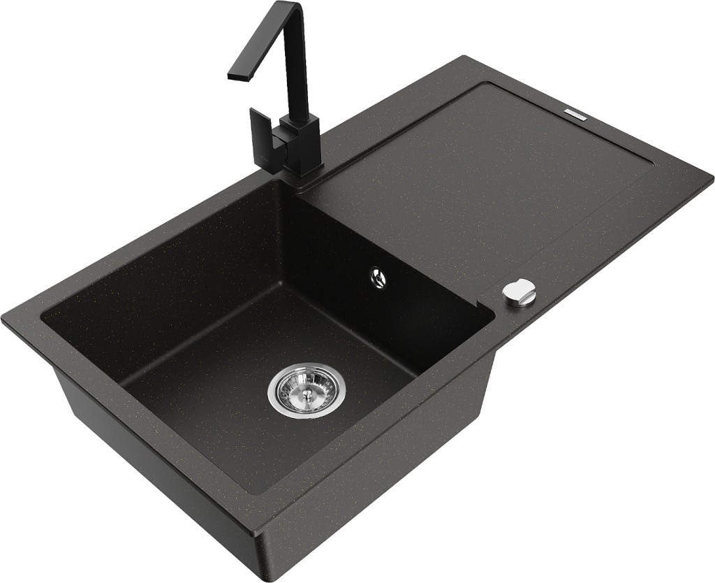 Technické dáta: drez: Rozmer: 900x500x190mm Hĺbka komory: 180 mm Rozmery komory: 430x415 mm Priemer odtoku: ø90 mm Typ: 1-miska s odkvapkávačom Typ: Zapustené do pracovnej dosky Farba: čierna / zlatá metalíza Povrchová úprava sifónu: Chrome Materiál: žula (80% žulové kamenivo, 20% živice) Prepadový otvor: Áno Otvory: (batérie, automatické) 2 Inštalácia: Univerzálna, je možné inštalovať s odkvapkávačom na ľavú alebo pravú stranu Vysoká odolnosť proti poškriabaniu a zmene farby Odolnosť proti tepelným šokom Ľahko čistiteľný povrch Dva dodatočné vyfrézované otvory na samodierovanie ø35 kuchynská batéria: Materiál: mosadz Čierna farba Hlava: Keramická Prevzdušňovač: Áno Typ: Jedna páka Výška batérie: 290 mm Rozsah výtoku: 220 mm(GT) Ean: 5905315017093