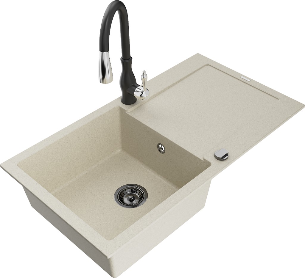 Technické dáta: drez: Rozmer: 900x500x190mm Hĺbka komory: 180 mm Rozmery komory: 430x415 mm Priemer odtoku: ø90 mm Typ: 1-miska s odkvapkávačom Typ: Zapustené do pracovnej dosky Farba béžová Povrchová úprava sifónu: čierna Materiál: žula (80% žulové kamenivo, 20% živice) Prepadový otvor: Áno Otvory: (batérie, automatické) 2 Inštalácia: Univerzálna, je možné inštalovať s odkvapkávačom na ľavú alebo pravú stranu Vysoká odolnosť proti poškriabaniu a zmene farby Odolnosť proti tepelným šokom Ľahko čistiteľný povrch Dva dodatočné vyfrézované otvory na samodierovanie ø35 kuchynská batéria: Materiál: mosadz Čierna farba Hlava: Keramická Prevzdušňovač: Áno Výška batérie: 410 mm Rozsah výtoku: 231 mm(GT) Ean: 5905315032331