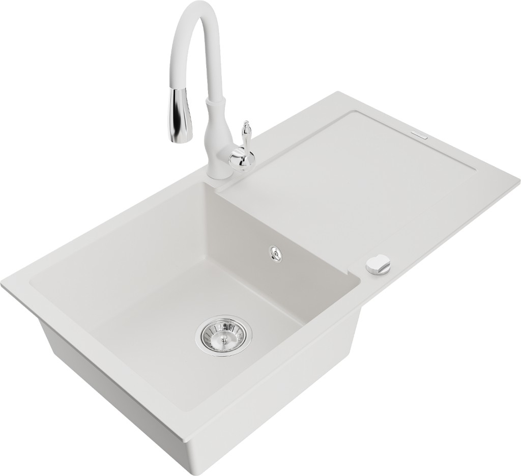 Technické dáta: drez: Rozmer: 900x500x190mm Hĺbka komory: 180 mm Rozmery komory: 430x415 mm Priemer odtoku: ø90 mm Typ: 1-miska s odkvapkávačom Typ: Zapustené do pracovnej dosky biela farba Povrchová úprava sifónu: Chrome Materiál: žula (80% žulové kamenivo, 20% živice) Prepadový otvor: Áno Otvory: (batérie, automatické) 2 Inštalácia: Univerzálna, je možné inštalovať s odkvapkávačom na ľavú alebo pravú stranu Vysoká odolnosť proti poškriabaniu a zmene farby Odolnosť proti tepelným šokom Ľahko čistiteľný povrch Dva dodatočné vyfrézované otvory na samodierovanie ø35 kuchynská batéria: Materiál: mosadz biela farba Hlava: Keramická Prevzdušňovač: Áno Výška batérie: 410 mm Rozsah výtoku: 231 mm (GT) Ean: 5905315032270