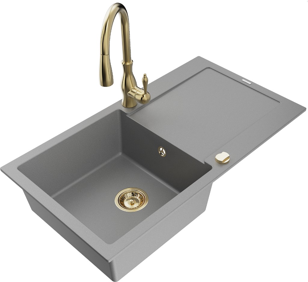 Technické dáta: drez: Rozmer: 900x500x190mm Hĺbka komory: 180 mm Rozmery komory: 430x415 mm Priemer odtoku: ø90 mm Typ: 1-miska s odkvapkávačom Typ: Zapustené do pracovnej dosky Šedá farba Povrchová úprava sifónu: zlatá Materiál: žula (80% žulové kamenivo, 20% živice) Prepadový otvor: Áno Otvory: (batérie, automatické) 2 Inštalácia: Univerzálna, je možné inštalovať s odkvapkávačom na ľavú alebo pravú stranu Vysoká odolnosť proti poškriabaniu a zmene farby Odolnosť proti tepelným šokom Ľahko čistiteľný povrch Dva dodatočné vyfrézované otvory na samodierovanie ø35 kuchynská batéria: Materiál: mosadz Farba: Zlatá Hlava: Keramická Prevzdušňovač: Áno Výška batérie: 410 mm Rozsah výtoku: 231 mm(GT) Ean: 5905315032355
