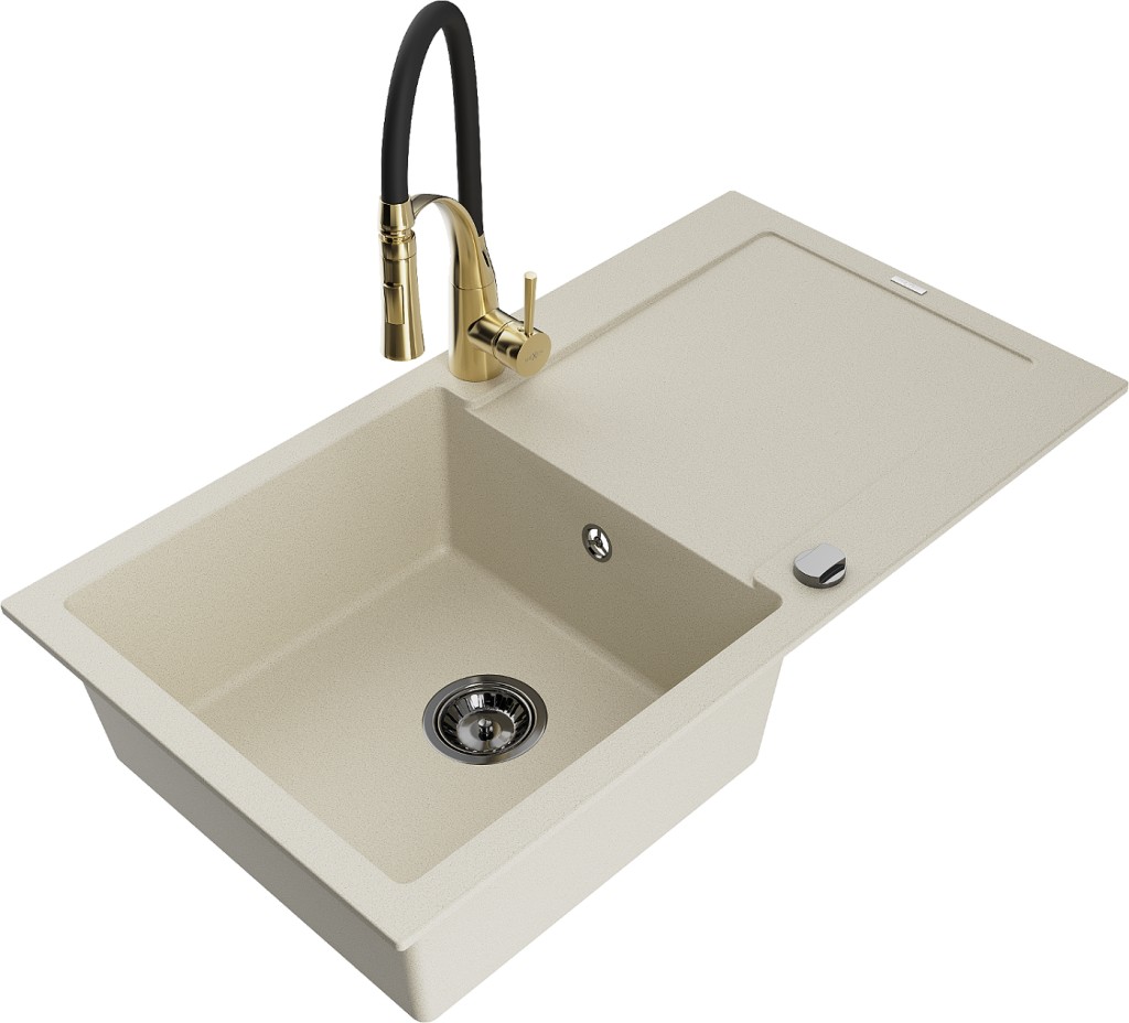 Technické dáta: drez: Rozmer: 900x500x190mm Hĺbka komory: 180 mm Rozmery komory: 430x415 mm Priemer odtoku: ø90 mm Typ: 1-miska s odkvapkávačom Typ: Zapustené do pracovnej dosky Farba béžová Povrchová úprava sifónu: čierna Materiál: žula (80% žulové kamenivo, 20% živice) Prepadový otvor: Áno Otvory: (batérie, automatické) 2 Inštalácia: Univerzálna, je možné inštalovať s odkvapkávačom na ľavú alebo pravú stranu Vysoká odolnosť proti poškriabaniu a zmene farby Odolnosť proti tepelným šokom Ľahko čistiteľný povrch Dva dodatočné vyfrézované otvory na samodierovanie ø35 kuchynská batéria: Materiál: mosadz Farba: Zlatá/Čierna Hlava: Keramická Prevzdušňovač: Áno Typ: Jedna páka Výška batérie: 430 mm Rozsah výtoku: 185 mm Batéria má výsuvný výtok(GT) Ean: 5905315042613
