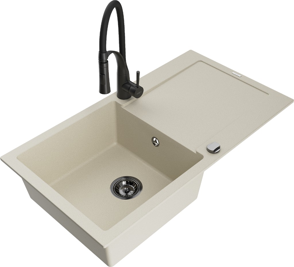 Technické dáta: drez: Rozmer: 900x500x190mm Hĺbka komory: 180 mm Rozmery komory: 430x415 mm Priemer odtoku: ø90 mm Typ: 1-miska s odkvapkávačom Typ: Zapustené do pracovnej dosky Farba béžová Povrchová úprava sifónu: čierna Materiál: žula (80% žulové kamenivo, 20% živice) Prepadový otvor: Áno Otvory: (batérie, automatické) 2 Inštalácia: Univerzálna, je možné inštalovať s odkvapkávačom na ľavú alebo pravú stranu Vysoká odolnosť proti poškriabaniu a zmene farby Odolnosť proti tepelným šokom Ľahko čistiteľný povrch Dva dodatočné vyfrézované otvory na samodierovanie ø35 kuchynská batéria: Materiál: mosadz Čierna farba Hlava: Keramická Prevzdušňovač: Áno Typ: Jedna páka Výška batérie: 430 mm Rozsah výtoku: 185 mm Batéria má výsuvný výtok(GT) Ean: 5905315042620