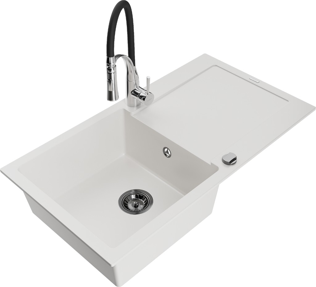 Technické dáta: drez: Rozmer: 900x500x190mm Hĺbka komory: 180 mm Rozmery komory: 430x415 mm Priemer odtoku: ø90 mm Typ: 1-miska s odkvapkávačom Typ: Zapustené do pracovnej dosky biela farba Povrchová úprava sifónu: čierna Materiál: žula (80% žulové kamenivo, 20% živice) Prepadový otvor: Áno Otvory: (batérie, automatické) 2 Inštalácia: Univerzálna, je možné inštalovať s odkvapkávačom na ľavú alebo pravú stranu Vysoká odolnosť proti poškriabaniu a zmene farby Odolnosť proti tepelným šokom Ľahko čistiteľný povrch Dva dodatočné vyfrézované otvory na samodierovanie ø35 kuchynská batéria: Materiál: mosadz Farba: chróm/čierna Hlava: Keramická Prevzdušňovač: Áno Typ: Jedna páka Výška batérie: 430 mm Rozsah výtoku: 185 mm Batéria má výsuvný výtok(GT) Ean: 5905315042538