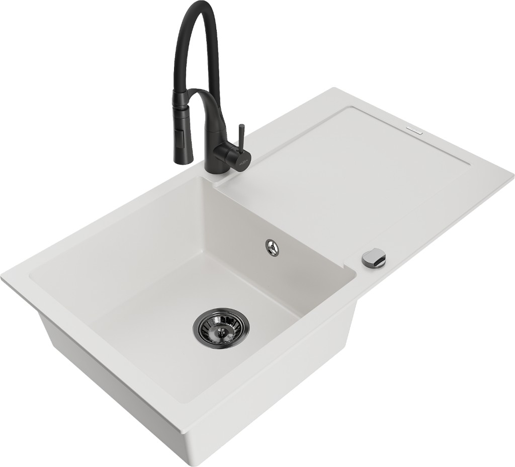 Technické dáta: drez: Rozmer: 900x500x190mm Hĺbka komory: 180 mm Rozmery komory: 430x415 mm Priemer odtoku: ø90 mm Typ: 1-miska s odkvapkávačom Typ: Zapustené do pracovnej dosky biela farba Povrchová úprava sifónu: čierna Materiál: žula (80% žulové kamenivo, 20% živice) Prepadový otvor: Áno Otvory: (batérie, automatické) 2 Inštalácia: Univerzálna, je možné inštalovať s odkvapkávačom na ľavú alebo pravú stranu Vysoká odolnosť proti poškriabaniu a zmene farby Odolnosť proti tepelným šokom Ľahko čistiteľný povrch Dva dodatočné vyfrézované otvory na samodierovanie ø35 kuchynská batéria: Materiál: mosadz Čierna farba Hlava: Keramická Prevzdušňovač: Áno Typ: Jedna páka Výška batérie: 430 mm Rozsah výtoku: 185 mm Batéria má výsuvný výtok(GT) Ean: 5905315042569