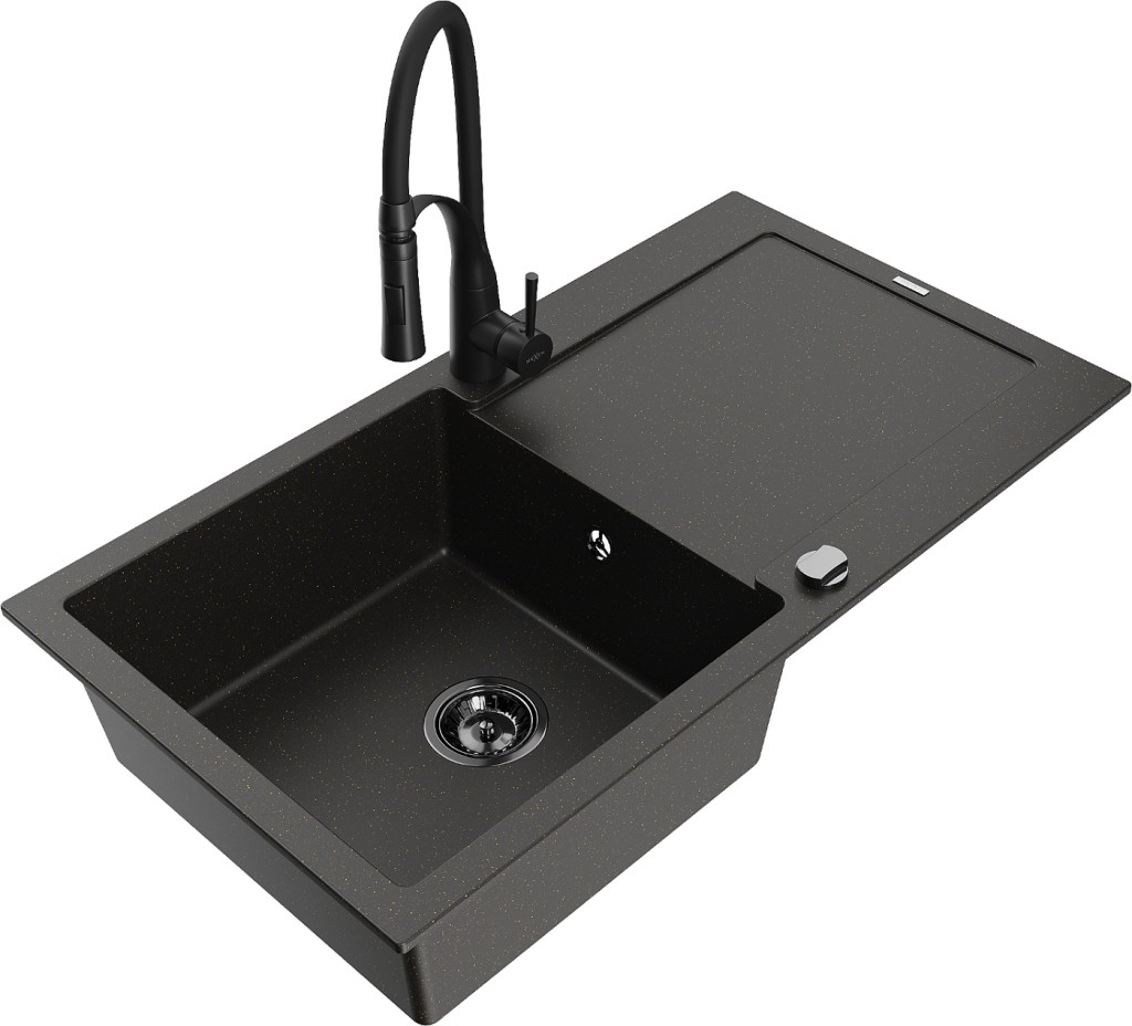 Technické dáta: drez: Rozmer: 900x500x190mm Hĺbka komory: 180 mm Rozmery komory: 430x415 mm Priemer odtoku: ø90 mm Typ: 1-miska s odkvapkávačom Typ: Zapustené do pracovnej dosky Farba: čierna / zlatá metalíza Povrchová úprava sifónu: čierna Materiál: žula (80% žulové kamenivo, 20% živice) Prepadový otvor: Áno Otvory: (batérie, automatické) 2 Inštalácia: Univerzálna, je možné inštalovať s odkvapkávačom na ľavú alebo pravú stranu Vysoká odolnosť proti poškriabaniu a zmene farby Odolnosť proti tepelným šokom Ľahko čistiteľný povrch Dva dodatočné vyfrézované otvory na samodierovanie ø35 kuchynská batéria: Materiál: mosadz Čierna farba Hlava: Keramická Prevzdušňovač: Áno Typ: Jedna páka Výška batérie: 430 mm Rozsah výtoku: 185 mm Batéria má výsuvný výtok(GT) Ean: 5905315042804