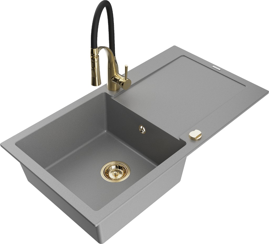 Technické dáta: drez: Rozmer: 900x500x190mm Hĺbka komory: 180 mm Rozmery komory: 430x415 mm Priemer odtoku: ø90 mm Typ: 1-miska s odkvapkávačom Typ: Zapustené do pracovnej dosky Šedá farba Povrchová úprava sifónu: zlatá Materiál: žula (80% žulové kamenivo, 20% živice) Prepadový otvor: Áno Otvory: (batérie, automatické) 2 Inštalácia: Univerzálna, je možné inštalovať s odkvapkávačom na ľavú alebo pravú stranu Vysoká odolnosť proti poškriabaniu a zmene farby Odolnosť proti tepelným šokom Ľahko čistiteľný povrch Dva dodatočné vyfrézované otvory na samodierovanie ø35 kuchynská batéria: Materiál: mosadz Farba: Zlatá/Čierna Hlava: Keramická Prevzdušňovač: Áno Typ: Jedna páka Výška batérie: 430 mm Rozsah výtoku: 185 mm Batéria má výsuvný výtok(GT) Ean: 5905315042668