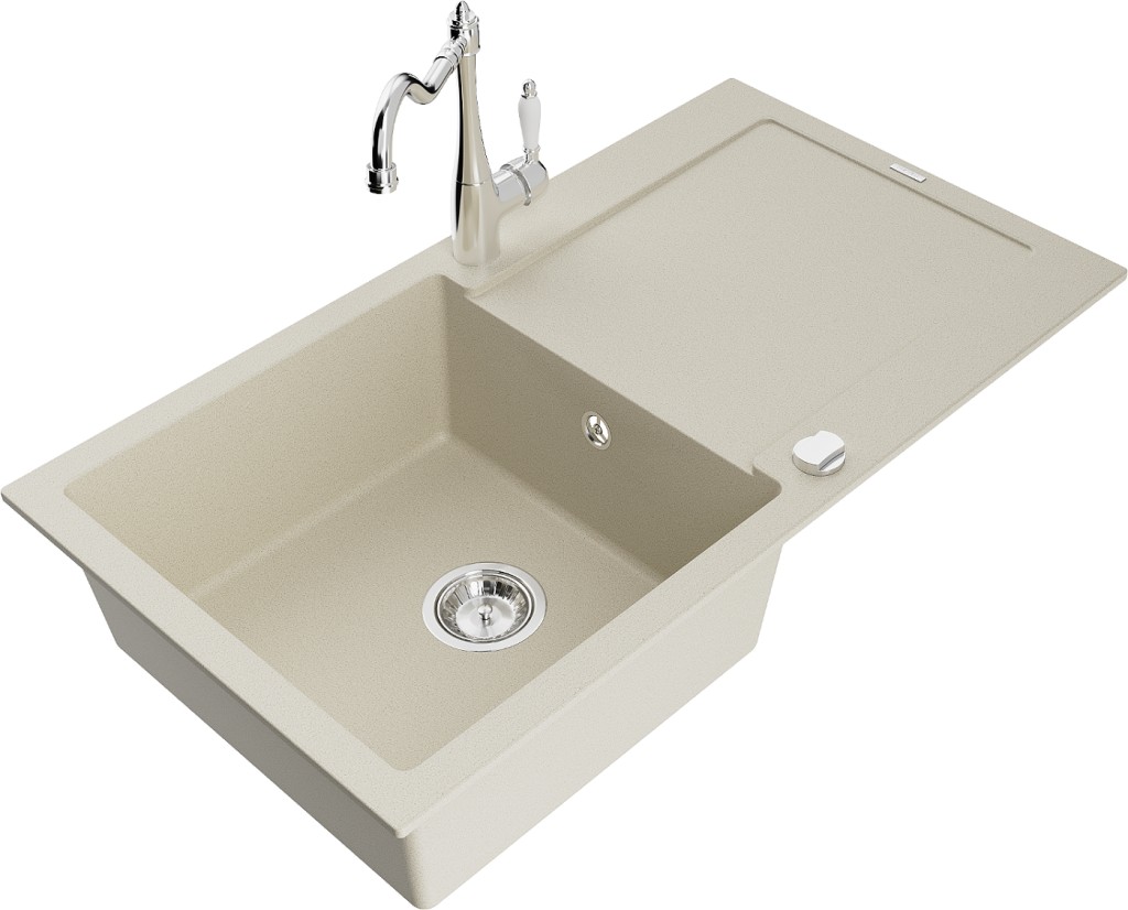 Technické dáta: drez: Rozmer: 900x500x190mm Hĺbka komory: 180 mm Rozmery komory: 430x415 mm Priemer odtoku: ø90 mm Typ: 1-miska s odkvapkávačom Typ: Zapustené do pracovnej dosky Farba béžová Povrchová úprava sifónu: Chrome Materiál: žula (80% žulové kamenivo, 20% živice) Prepadový otvor: Áno Otvory: (batérie, automatické) 2 Inštalácia: Univerzálna, je možné inštalovať s odkvapkávačom na ľavú alebo pravú stranu Vysoká odolnosť proti poškriabaniu a zmene farby Odolnosť proti tepelným šokom Ľahko čistiteľný povrch Dva dodatočné vyfrézované otvory na samodierovanie ø35 kuchynská batéria: Materiál: mosadz Farba: Chrome Hlava: Keramická Prevzdušňovač: Áno Typ: Jedna páka Výška batérie: 290 mm Rozsah výtoku: 260 mm(GT) Ean: 5905315037428