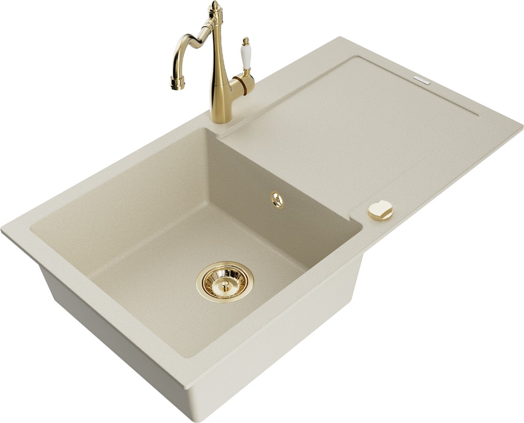 Technické dáta: drez: Rozmer: 900x500x190mm Hĺbka komory: 180 mm Rozmery komory: 430x415 mm Priemer odtoku: ø90 mm Typ: 1-miska s odkvapkávačom Typ: Zapustené do pracovnej dosky Farba béžová Povrchová úprava sifónu: zlatá Materiál: žula (80% žulové kamenivo, 20% živice) Prepadový otvor: Áno Otvory: (batérie, automatické) 2 Inštalácia: Univerzálna, je možné inštalovať s odkvapkávačom na ľavú alebo pravú stranu Vysoká odolnosť proti poškriabaniu a zmene farby Odolnosť proti tepelným šokom Ľahko čistiteľný povrch Dva dodatočné vyfrézované otvory na samodierovanie ø35 kuchynská batéria: Materiál: mosadz Farba: Zlatá Hlava: Keramická Prevzdušňovač: Áno Typ: Jedna páka Výška batérie: 290 mm Rozsah výtoku: 260 mm(GT) Ean: 5905315037442