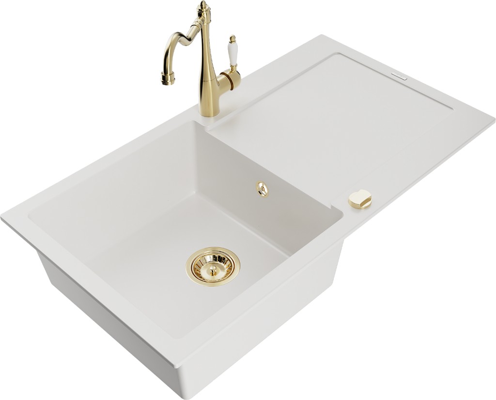 Technické dáta: drez: Rozmer: 900x500x190mm Hĺbka komory: 180 mm Rozmery komory: 430x415 mm Priemer odtoku: ø90 mm Typ: 1-miska s odkvapkávačom Typ: Zapustené do pracovnej dosky biela farba Povrchová úprava sifónu: zlatá Materiál: žula (80% žulové kamenivo, 20% živice) Prepadový otvor: Áno Otvory: (batérie, automatické) 2 Inštalácia: Univerzálna, je možné inštalovať s odkvapkávačom na ľavú alebo pravú stranu Vysoká odolnosť proti poškriabaniu a zmene farby Odolnosť proti tepelným šokom Ľahko čistiteľný povrch Dva dodatočné vyfrézované otvory na samodierovanie ø35 kuchynská batéria: Materiál: mosadz Farba: Zlatá Hlava: Keramická Prevzdušňovač: Áno Typ: Jedna páka Výška batérie: 290 mm Rozsah výtoku: 260 mm(GT) Ean: 5905315037404