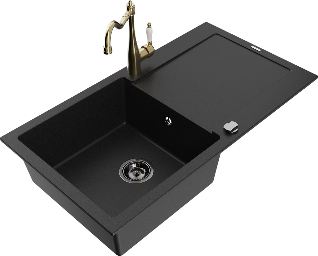 Technické dáta: drez: Rozmer: 900x500x190mm Hĺbka komory: 180 mm Rozmery komory: 430x415 mm Priemer odtoku: ø90 mm Typ: 1-miska s odkvapkávačom Typ: Zapustené do pracovnej dosky Čierna farba Povrchová úprava sifónu: čierna Materiál: žula (80% žulové kamenivo, 20% živice) Prepadový otvor: Áno Otvory: (batérie, automatické) 2 Inštalácia: Univerzálna, je možné inštalovať s odkvapkávačom na ľavú alebo pravú stranu Vysoká odolnosť proti poškriabaniu a zmene farby Odolnosť proti tepelným šokom Ľahko čistiteľný povrch Dva dodatočné vyfrézované otvory na samodierovanie ø35 kuchynská batéria: Materiál: mosadz Farba: Zlatá Hlava: Keramická Prevzdušňovač: Áno Typ: Jedna páka Výška batérie: 290 mm Rozsah výtoku: 260 mm(GT) Ean: 5905315037671
