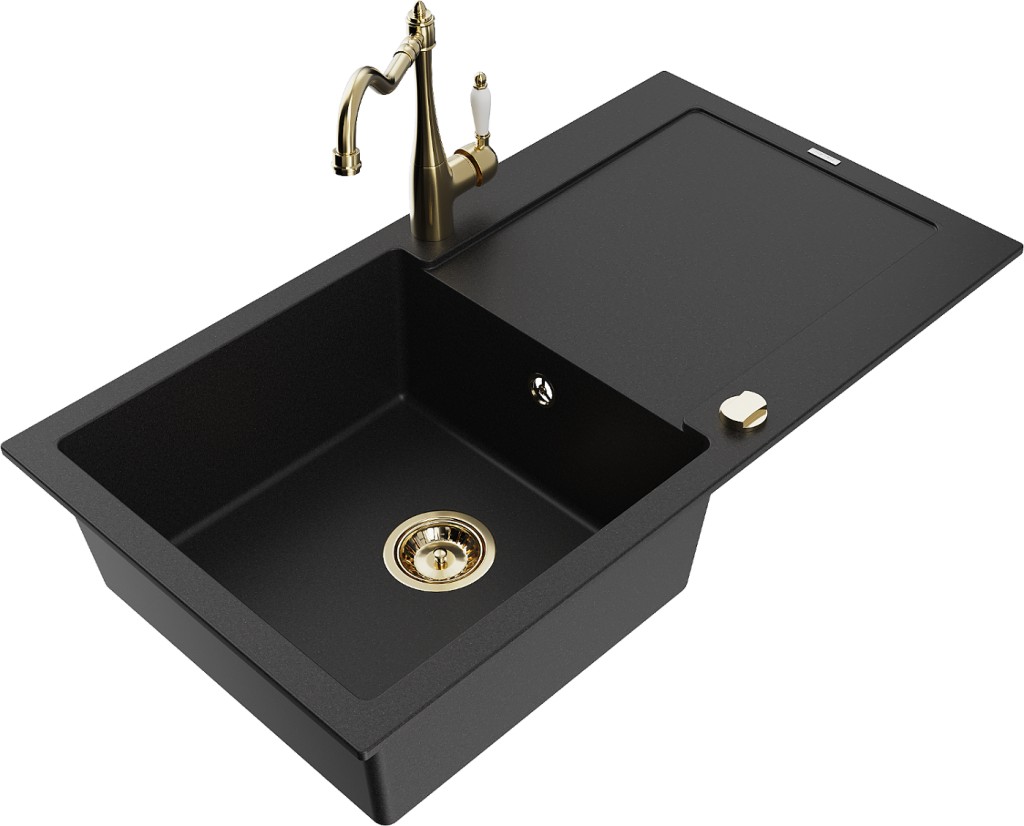 Technické dáta: drez: Rozmer: 900x500x190mm Hĺbka komory: 180 mm Rozmery komory: 430x415 mm Priemer odtoku: ø90 mm Typ: 1-miska s odkvapkávačom Typ: Zapustené do pracovnej dosky Čierna farba Povrchová úprava sifónu: zlatá Materiál: žula (80% žulové kamenivo, 20% živice) Prepadový otvor: Áno Otvory: (batérie, automatické) 2 Inštalácia: Univerzálna, je možné inštalovať s odkvapkávačom na ľavú alebo pravú stranu Vysoká odolnosť proti poškriabaniu a zmene farby Odolnosť proti tepelným šokom Ľahko čistiteľný povrch Dva dodatočné vyfrézované otvory na samodierovanie ø35 kuchynská batéria: Materiál: mosadz Farba: Zlatá Hlava: Keramická Prevzdušňovač: Áno Typ: Jedna páka Výška batérie: 290 mm Rozsah výtoku: 260 mm(GT) Ean: 5905315037664
