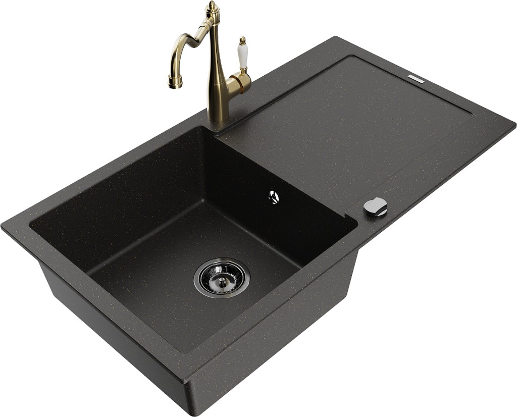 Technické dáta: drez: Rozmer: 900x500x190mm Hĺbka komory: 180 mm Rozmery komory: 430x415 mm Priemer odtoku: ø90 mm Typ: 1-miska s odkvapkávačom Typ: Zapustené do pracovnej dosky Farba: čierna / zlatá metalíza Povrchová úprava sifónu: čierna Materiál: žula (80% žulové kamenivo, 20% živice) Prepadový otvor: Áno Otvory: (batérie, automatické) 2 Inštalácia: Univerzálna, je možné inštalovať s odkvapkávačom na ľavú alebo pravú stranu Vysoká odolnosť proti poškriabaniu a zmene farby Odolnosť proti tepelným šokom Ľahko čistiteľný povrch Dva dodatočné vyfrézované otvory na samodierovanie ø35 kuchynská batéria: Materiál: mosadz Farba: Zlatá Hlava: Keramická Prevzdušňovač: Áno Typ: Jedna páka Výška batérie: 290 mm Rozsah výtoku: 260 mm(GT) Ean: 5905315037572