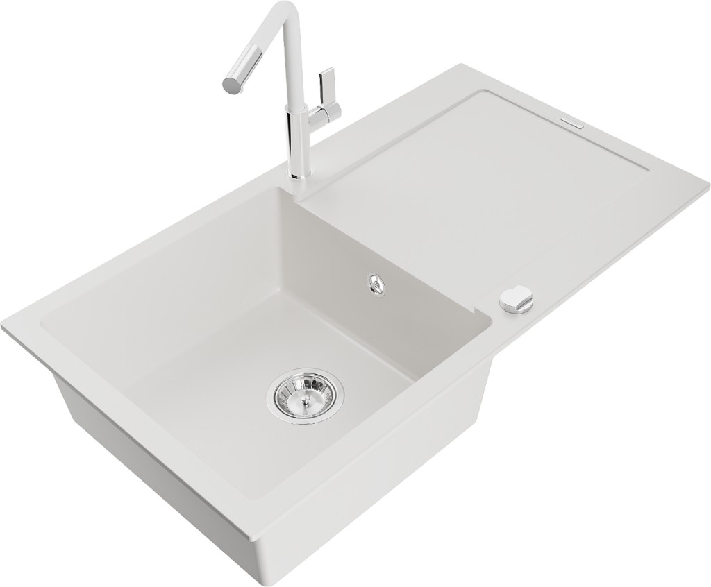 Technické dáta: drez: Rozmer: 900x500x190mm Hĺbka komory: 180 mm Rozmery komory: 430x415 mm Priemer odtoku: ø90 mm Typ: 1-miska s odkvapkávačom Typ: Zapustené do pracovnej dosky biela farba Povrchová úprava sifónu: Chrome Materiál: žula (80% žulové kamenivo, 20% živice) Prepadový otvor: Áno Otvory: (batérie, automatické) 2 Inštalácia: Univerzálna, je možné inštalovať s odkvapkávačom na ľavú alebo pravú stranu Vysoká odolnosť proti poškriabaniu a zmene farby Odolnosť proti tepelným šokom Ľahko čistiteľný povrch Dva dodatočné vyfrézované otvory na samodierovanie ø35 kuchynská batéria: Materiál: mosadz Farba: chróm/biela Hlava: Keramická Prevzdušňovač: Áno Typ: Jedna páka Rozsah výtoku: 245 mm Výška batérie: 307 mm(GT) Ean: 5905315055965