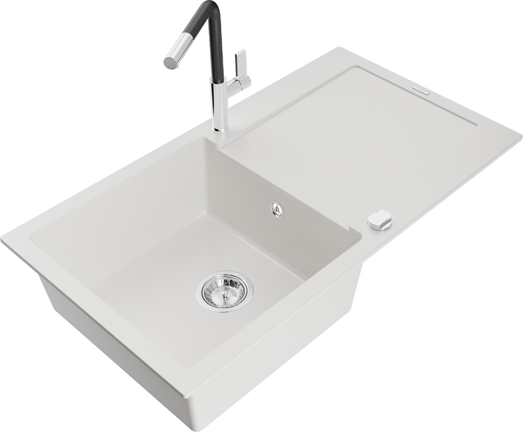 Technické dáta: drez: Rozmer: 900x500x190mm Hĺbka komory: 180 mm Rozmery komory: 430x415 mm Priemer odtoku: ø90 mm Typ: 1-miska s odkvapkávačom Typ: Zapustené do pracovnej dosky biela farba Povrchová úprava sifónu: Chrome Materiál: žula (80% žulové kamenivo, 20% živice) Prepadový otvor: Áno Otvory: (batérie, automatické) 2 Inštalácia: Univerzálna, je možné inštalovať s odkvapkávačom na ľavú alebo pravú stranu Vysoká odolnosť proti poškriabaniu a zmene farby Odolnosť proti tepelným šokom Ľahko čistiteľný povrch Dva dodatočné vyfrézované otvory na samodierovanie ø35 kuchynská batéria: Materiál: mosadz Farba: chróm/čierna Hlava: Keramická Prevzdušňovač: Áno Typ: Jedna páka Rozsah výtoku: 245 mm Výška batérie: 307 mm(GT) Ean: 5905315055989