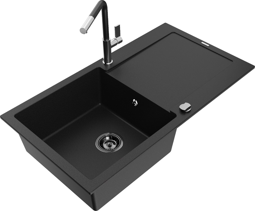 Technické dáta: drez: Rozmer: 900x500x190mm Hĺbka komory: 180 mm Rozmery komory: 430x415 mm Priemer odtoku: ø90 mm Typ: 1-miska s odkvapkávačom Typ: Zapustené do pracovnej dosky Čierna farba Povrchová úprava sifónu: čierna Materiál: žula (80% zlatá žula 20% živice) Prepadový otvor: Áno Otvory: (batérie, automatické) 2 Inštalácia: Univerzálna, je možné inštalovať s odkvapkávačom na ľavú alebo pravú stranu Vysoká odolnosť proti poškriabaniu a zmene farby Odolnosť proti tepelným šokom Ľahko čistiteľný povrch Dva dodatočné vyfrézované otvory na samodierovanie ø35 kuchynská batéria: Materiál: mosadz Farba: chróm/čierna Hlava: Keramická Prevzdušňovač: Áno Typ: Jedna páka Rozsah výtoku: 245 mm Výška batérie: 307 mm(GT) Ean: 5905315056412