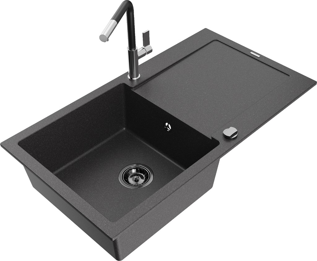 Technické dáta: drez: Rozmer: 900x500x190mm Hĺbka komory: 180 mm Rozmery komory: 430x415 mm Priemer odtoku: ø90 mm Typ: 1-miska s odkvapkávačom Typ: Zapustené do pracovnej dosky Farba: Škvrnitá čierna Povrchová úprava sifónu: čierna Materiál: žula (80% žulové kamenivo, 20% živice) Prepadový otvor: Áno Otvory: (batérie, automatické) 2 Inštalácia: Univerzálna, je možné inštalovať s odkvapkávačom na ľavú alebo pravú stranu Vysoká odolnosť proti poškriabaniu a zmene farby Odolnosť proti tepelným šokom Ľahko čistiteľný povrch Dva dodatočné vyfrézované otvory na samodierovanie ø35 kuchynská batéria: Materiál: mosadz Farba: chróm/čierna Hlava: Keramická Prevzdušňovač: Áno Typ: Jedna páka Rozsah výtoku: 245 mm Výška batérie: 307 mm(GT) Ean: 5905315056313
