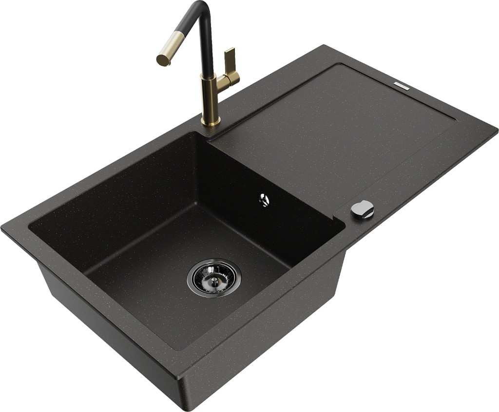 Technické dáta: drez: Rozmer: 900x500x190mm Hĺbka komory: 180 mm Rozmery komory: 430x415 mm Priemer odtoku: ø90 mm Typ: 1-miska s odkvapkávačom Typ: Zapustené do pracovnej dosky Farba: čierna / zlatá metalíza Povrchová úprava sifónu: čierna Materiál: žula (80% žulové kamenivo, 20% živice) Prepadový otvor: Áno Otvory: (batérie, automatické) 2 Inštalácia: Univerzálna, je možné inštalovať s odkvapkávačom na ľavú alebo pravú stranu Vysoká odolnosť proti poškriabaniu a zmene farby Odolnosť proti tepelným šokom Ľahko čistiteľný povrch Dva dodatočné vyfrézované otvory na samodierovanie ø35 kuchynská batéria: Materiál: mosadz Farba: Zlatá/Čierna Hlava: Keramická Prevzdušňovač: Áno Typ: Jedna páka Rozsah výtoku: 245 mm Výška batérie: 307 mm(GT) Ean: 5905315056276