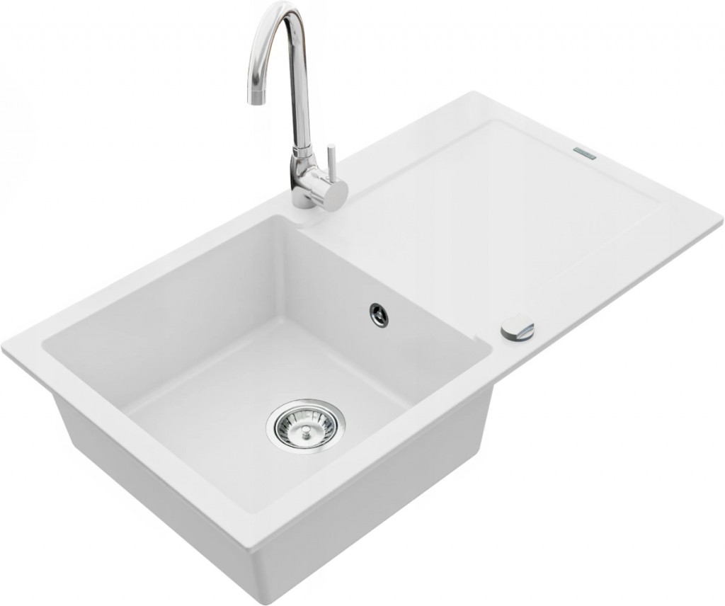 Technické dáta: drez: Rozmer: 900x500x190mm Hĺbka komory: 180 mm Rozmery komory: 430x415 mm Priemer odtoku: ø90 mm Typ: 1-miska s odkvapkávačom Typ: Zapustené do pracovnej dosky biela farba Povrchová úprava sifónu: Chrome Materiál: žula (80% žulové kamenivo, 20% živice) Prepadový otvor: Áno Otvory: (batérie, automatické) 2 Inštalácia: Univerzálna, je možné inštalovať s odkvapkávačom na ľavú alebo pravú stranu Vysoká odolnosť proti poškriabaniu a zmene farby Odolnosť proti tepelným šokom Ľahko čistiteľný povrch Dva dodatočné vyfrézované otvory na samodierovanie ø35 kuchynská batéria: Materiál: mosadz Farba: Chrome Hlava: Keramická Prevzdušňovač: Áno Výška batérie: 335 mm Rozsah výtoku: 180 mm (GT) Ean: 5907709188952
