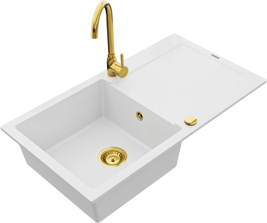 Technické dáta: drez: Rozmer: 900x500x190mm Hĺbka komory: 180 mm Rozmery komory: 430x415 mm Priemer odtoku: ø90 mm Typ: 1-miska s odkvapkávačom Typ: Zapustené do pracovnej dosky biela farba Povrchová úprava sifónu: zlatá Materiál: žula (80% žulové kamenivo, 20% živice) Prepadový otvor: Áno Otvory: (batérie, automatické) 2 Inštalácia: Univerzálna, je možné inštalovať s odkvapkávačom na ľavú alebo pravú stranu Vysoká odolnosť proti poškriabaniu a zmene farby Odolnosť proti tepelným šokom Ľahko čistiteľný povrch Dva dodatočné vyfrézované otvory na samodierovanie ø35 kuchynská batéria: Materiál: mosadz Farba: Zlatá Hlava: Keramická Prevzdušňovač: Áno Výška batérie: 335 mm Rozsah výtoku: 180 mm(GT) Ean: 5907709188976
