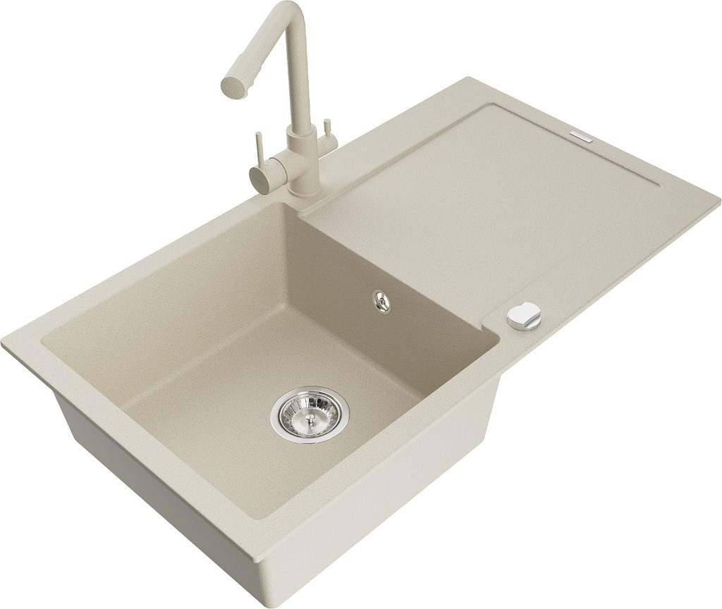 Technické dáta: drez: Rozmer: 900x500x190mm Hĺbka komory: 180 mm Rozmery komory: 430x415 mm Priemer odtoku: ø90 mm Typ: 1-miska s odkvapkávačom Typ: Zapustené do pracovnej dosky Farba béžová Povrchová úprava sifónu: Chrome Materiál: žula (80% žulové kamenivo, 20% živice) Prepadový otvor: Áno Otvory: (batérie, automatické) 2 Inštalácia: Univerzálna, je možné inštalovať s odkvapkávačom na ľavú alebo pravú stranu Vysoká odolnosť proti poškriabaniu a zmene farby Odolnosť proti tepelným šokom Ľahko čistiteľný povrch Dva dodatočné vyfrézované otvory na samodierovanie ø35 kuchynská batéria: Materiál: mosadz Farba béžová Hlava: Keramická Prevzdušňovač: Áno Typ: Dve rukoväte Rozsah výtoku: 235 mm Výška batérie: 315 mm Dvojhlavá batéria s prídavným kanálom pre filtrovanú pitnú vodu(GT) Ean: 5905315022066
