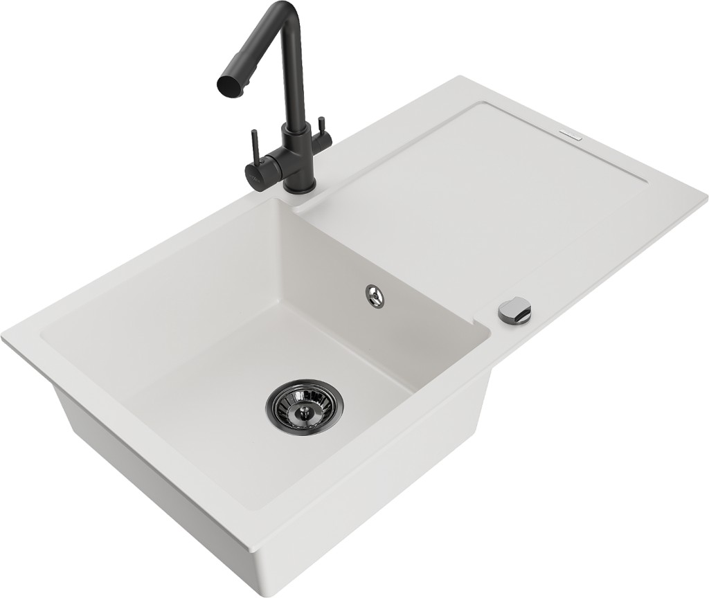 Technické dáta: drez: Rozmer: 900x500x190mm Hĺbka komory: 180 mm Rozmery komory: 430x415 mm Priemer odtoku: ø90 mm Typ: 1-miska s odkvapkávačom Typ: Zapustené do pracovnej dosky biela farba Povrchová úprava sifónu: čierna Materiál: žula (80% žulové kamenivo, 20% živice) Prepadový otvor: Áno Otvory: (batérie, automatické) 2 Inštalácia: Univerzálna, je možné inštalovať s odkvapkávačom na ľavú alebo pravú stranu Vysoká odolnosť proti poškriabaniu a zmene farby Odolnosť proti tepelným šokom Ľahko čistiteľný povrch Dva dodatočné vyfrézované otvory na samodierovanie ø35 kuchynská batéria: Materiál: mosadz Čierna farba Hlava: Keramická Prevzdušňovač: Áno Typ: Dve rukoväte Rozsah výtoku: 235 mm Výška batérie: 315 mm Dvojhlavá batéria s prídavným kanálom pre filtrovanú pitnú vodu(GT) Ean: 5905315022042