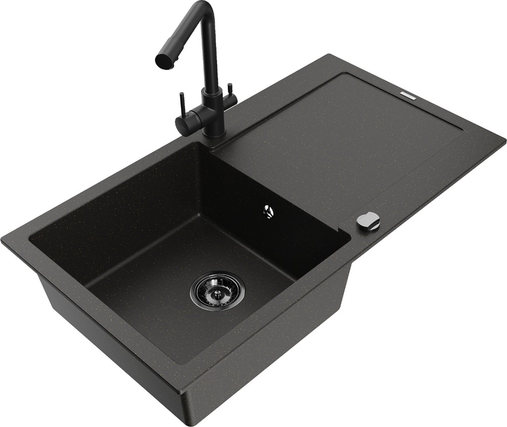 Technické dáta: drez: Rozmer: 900x500x190mm Hĺbka komory: 180 mm Rozmery komory: 430x415 mm Priemer odtoku: ø90 mm Typ: 1-miska s odkvapkávačom Typ: Zapustené do pracovnej dosky Farba: čierna / zlatá metalíza Povrchová úprava sifónu: čierna Materiál: žula (80% žulové kamenivo, 20% živice) Prepadový otvor: Áno Otvory: (batérie, automatické) 2 Inštalácia: Univerzálna, je možné inštalovať s odkvapkávačom na ľavú alebo pravú stranu Vysoká odolnosť proti poškriabaniu a zmene farby Odolnosť proti tepelným šokom Ľahko čistiteľný povrch Dva dodatočné vyfrézované otvory na samodierovanie ø35 kuchynská batéria: Materiál: mosadz Čierna farba Hlava: Keramická Prevzdušňovač: Áno Rozsah výtoku: 235 mm Výška batérie: 315 mm Typ: Dve rukoväte Dvojhlavá batéria s prídavným kanálom pre filtrovanú pitnú vodu(GT) Ean: 5905315022226