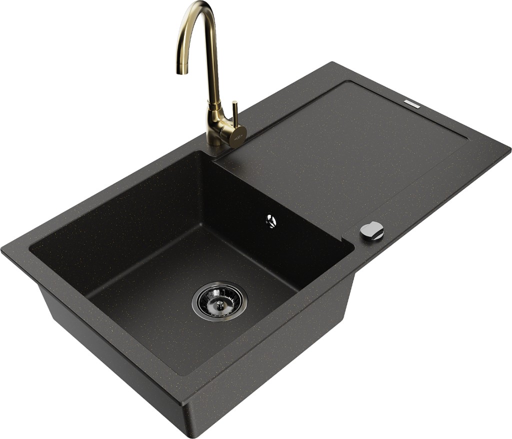 Technické dáta: drez: Rozmer: 900x500x190mm Hĺbka komory: 180 mm Rozmery komory: 430x415 mm Priemer odtoku: ø90 mm Typ: 1-miska s odkvapkávačom Typ: Zapustené do pracovnej dosky Farba: čierna / zlatá metalíza Povrchová úprava sifónu: čierna Materiál: žula (80% žulové kamenivo, 20% živice) Prepadový otvor: Áno Otvory: (batérie, automatické) 2 Inštalácia: Univerzálna, je možné inštalovať s odkvapkávačom na ľavú alebo pravú stranu Vysoká odolnosť proti poškriabaniu a zmene farby Odolnosť proti tepelným šokom Ľahko čistiteľný povrch Dva dodatočné vyfrézované otvory na samodierovanie ø35 kuchynská batéria: Materiál: mosadz Farba: Zlatá Hlava: Keramická Prevzdušňovač: Áno Typ: Jedna páka Výška batérie: 335 mm Rozsah výtoku: 180 mm(GT) Ean: 5905315013828