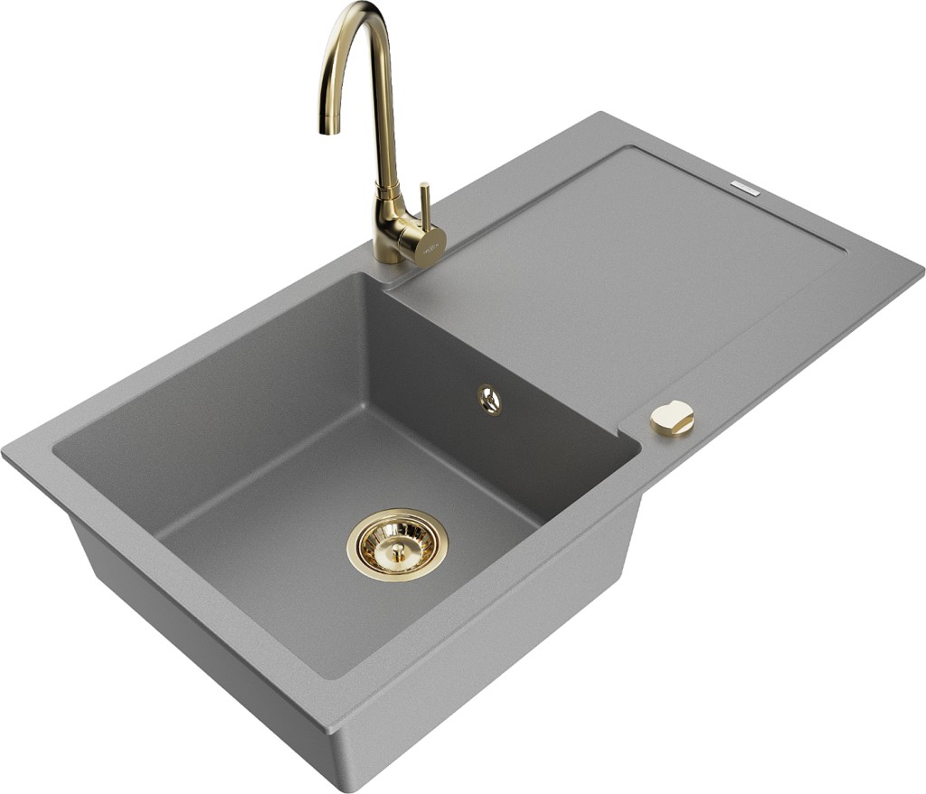 Technické dáta: drez: Rozmer: 900x500x190mm Hĺbka komory: 180 mm Rozmery komory: 430x415 mm Priemer odtoku: ø90 mm Typ: 1-miska s odkvapkávačom Typ: Zapustené do pracovnej dosky Šedá farba Povrchová úprava sifónu: zlatá Materiál: žula (80% žulové kamenivo, 20% živice) Prepadový otvor: Áno Otvory: (batérie, automatické) 2 Inštalácia: Univerzálna, je možné inštalovať s odkvapkávačom na ľavú alebo pravú stranu Vysoká odolnosť proti poškriabaniu a zmene farby Odolnosť proti tepelným šokom Ľahko čistiteľný povrch Dva dodatočné vyfrézované otvory na samodierovanie ø35 kuchynská batéria: Materiál: mosadz Farba: Zlatá Hlava: Keramická Prevzdušňovač: Áno Typ: Jedna páka Výška batérie: 335 mm Rozsah výtoku: 180 mm(GT) Ean: 5905315013767