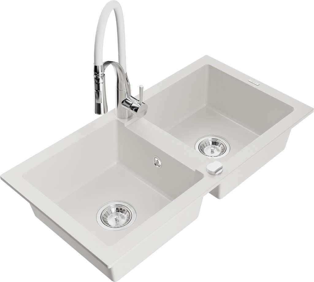 Technické dáta: drez: Rozmer: 820 x 436 x 161 mm Hĺbka komory: 151 mm Rozmery komory: 356x336 mm Priemer odtoku: ø90 mm Typ: 2-komorový Typ: Zapustené do pracovnej dosky biela farba Povrchová úprava sifónu: Chrome Materiál: žula (80% žulové kamenivo, 20% živice) Prepadový otvor: Áno Otvory: (batérie, automatické) 2 Vysoká odolnosť proti poškriabaniu a zmene farby Odolnosť proti tepelným šokom Ľahko čistiteľný povrch kuchynská batéria: Materiál: mosadz Farba: chróm/biela Hlava: Keramická Prevzdušňovač: Áno Typ: Jedna páka Výška batérie: 430 mm Rozsah výtoku: 185 mm Batéria má výsuvný výtok (GT) Ean: 5905315043771